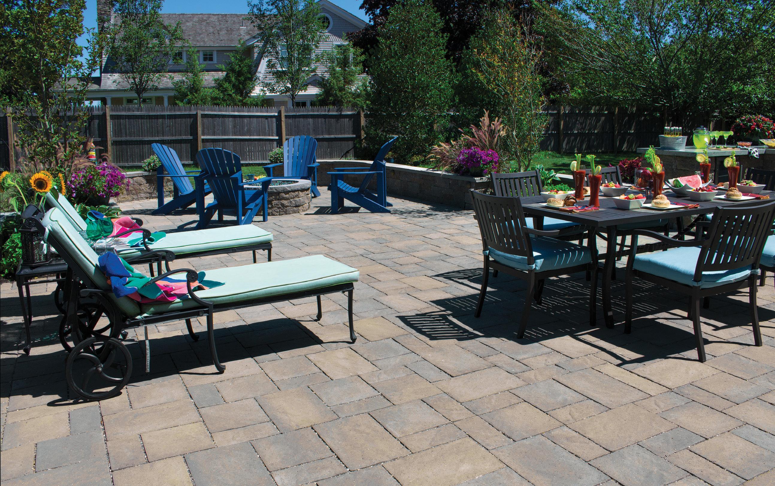 Andover Collection™ Pavers Ancestral™ Seat Walls with Bluestone Coping ScapeStone™ Fire Pit with CastStone Coping