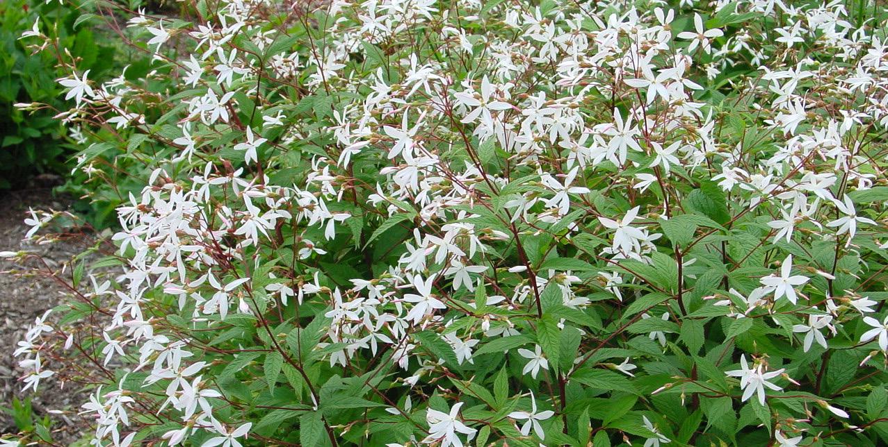 Gillenia blooms from May to July with clusters of 5-petaled starlike white flowers that resemble Gaura lindheimeri. It provides interest from spring until fall, as the narrow toothed leaves add a soft texture to the garden. Gillenia is a native plant found in the Northeastern parts of the United States and Canada. Combine Gillenia with Hosta, Heuchera, Alchemilla or other bold-leafed plants for a refreshing contrast. Gillenia also makes a great cut flower.
