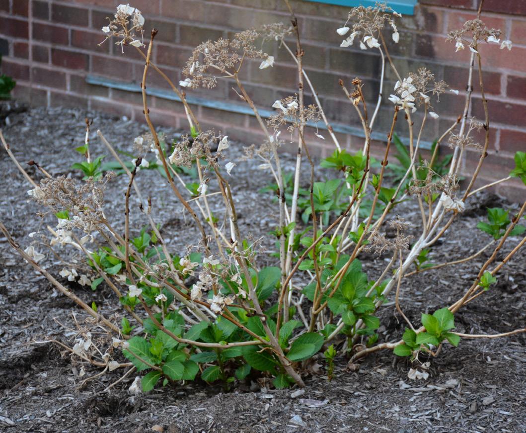 One of the most common reasons Hydrangea macrophylla don’t bloom is improper pruning. Traditional H.macrophylla bloom on old wood, meaning that flower buds develop on stems during the summer the year before they bloom, so pruning in late summer or fall can result in flower buds being pruned off. Pruning should be done after growth resumes in the spring and buds can be identified. Any dead branches can then be removed. Newer cultivars have been bred to bloom on both new and old wood, meaning that flower buds develop on both previous year and current year growth. However, most blooms still occur on old wood, and (continued on page 22)
