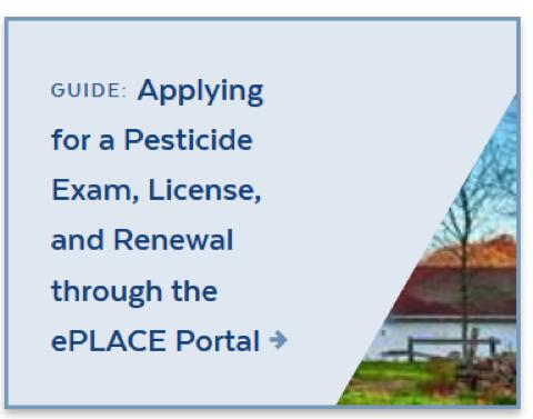 This new page provides specific assistance to those just starting their pesticide exam and license journey, especially with respect to using the new EEA ePLACE Portal. There are specific guides to walk the applicant step-by-step to create a new ePLACE Portal Account, register for exams, apply for licenses, renew licenses, etc. There is even an exhaustive Overview of the ePLACE Permitting Portal for the Pesticide Application Process.