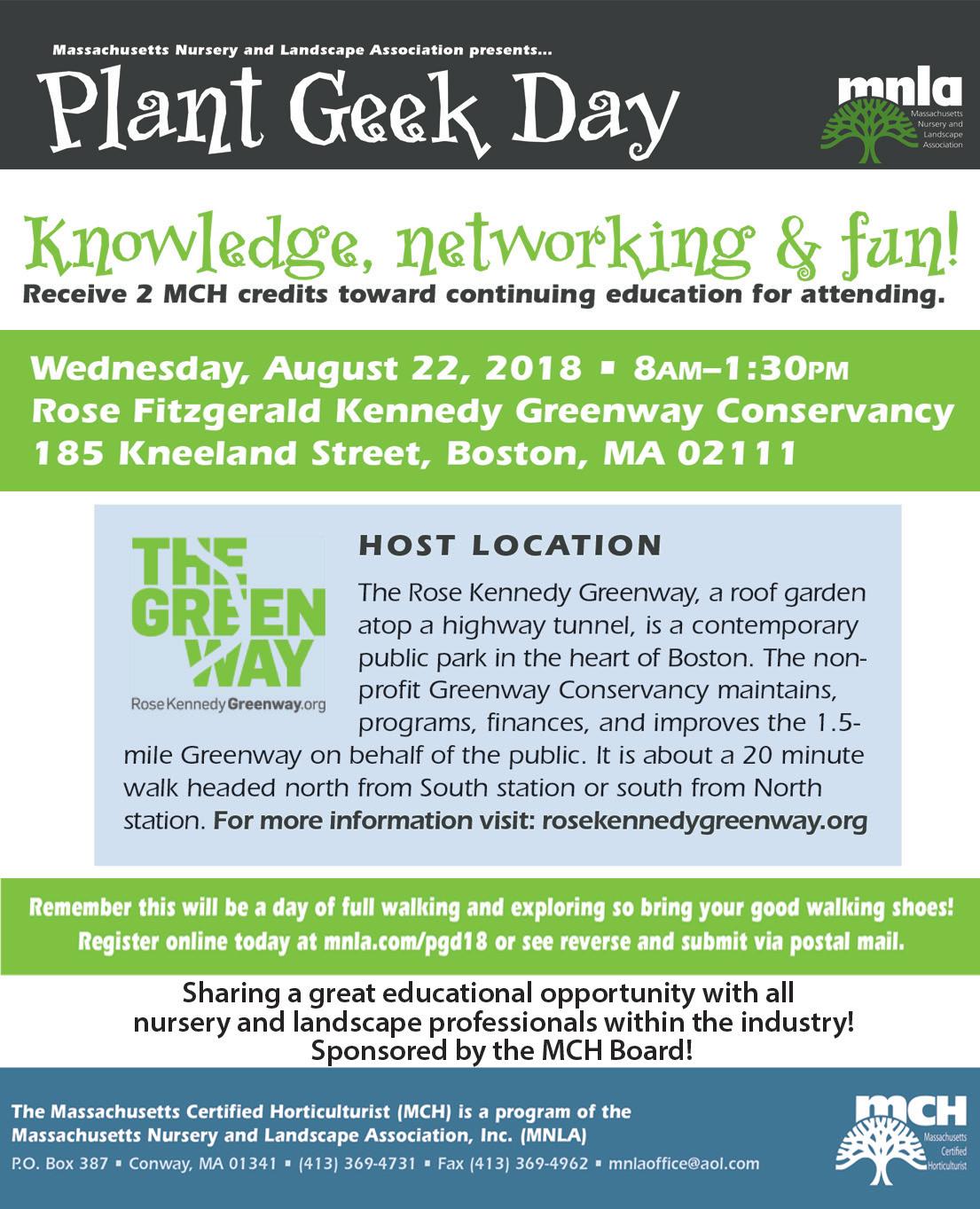 We encourage all MCHs to experience this year’s Plant Geek Day on Wednesday, August 22, at the Rose Kennedy Greenway in Boston from 8am to 2pm. This is always a great and informative event, allows us a break in our busy schedules, and supplies two MCH credits.