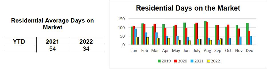 • The average Days on Market (DOM) is down significantly over this time last year and is at 34 days for homes and 147 days for land