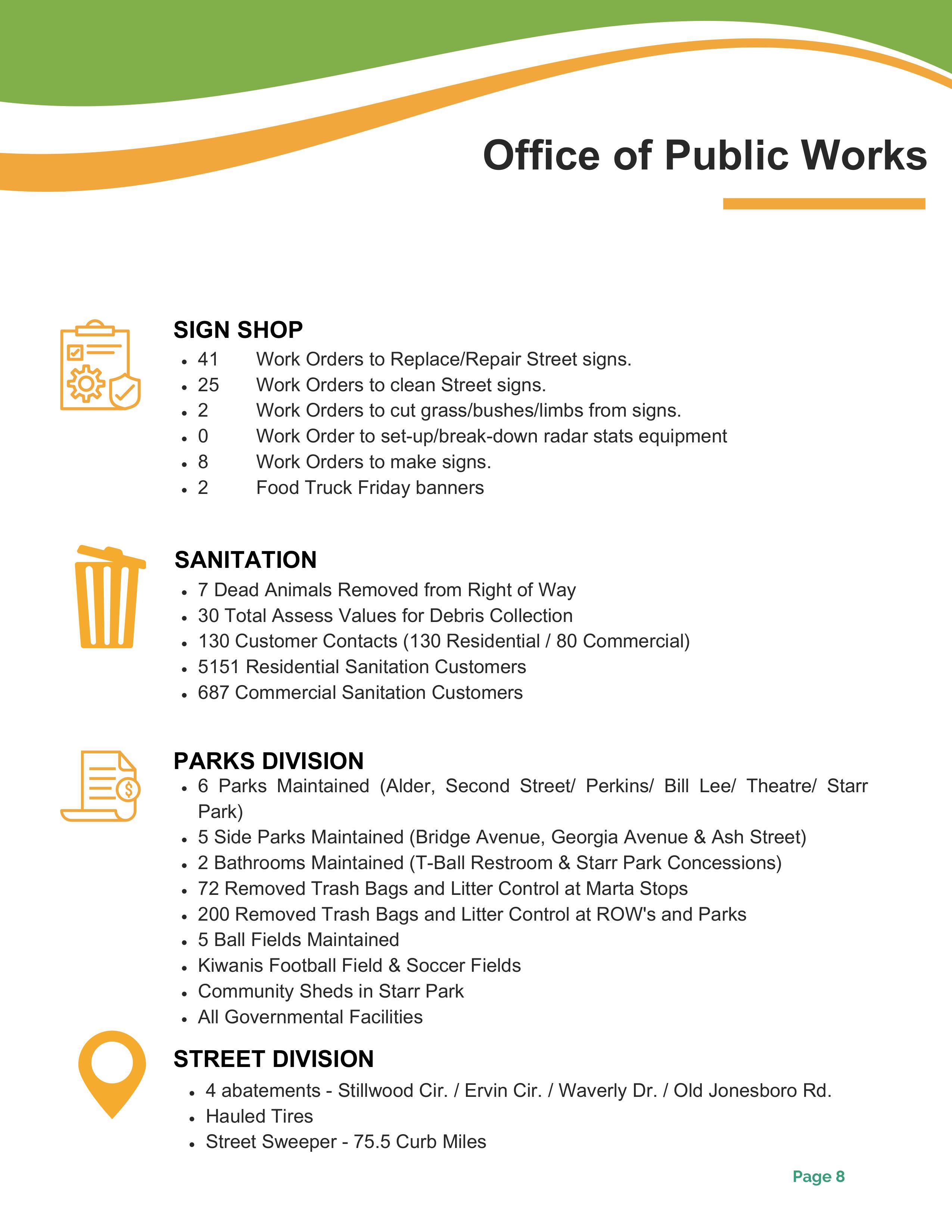 The City Manager's Office works cooperatively with all City Departments to prepare the Monthly Operations Report. The document was developed with the intent to create an additional communications tool highlighting ongoing and seasonal activities of each department. The report is intended to provide a "snapshot" of departmental operations and significant City activities on a monthly basis.