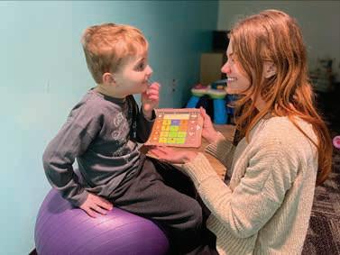 therapies today. Liam and Mark use an AAC device to help communicate with others. When they first started working with Physical and Occupational therapists, it was extremely challenging for everyone involved. The boys would just cry and cry, making it hard for the therapists to make progress. It got so bad that they took a break from therapy for a while. Once returning to therapy, the boys did much better when they could take their special blankets. Now they absolutely love it and race to be the first one in! These days they participate in Physical, Occupational, and Speech therapies at Akron Children’s Hospital. Akron Children’s has been a huge part of the Enold family’s life and they continue to support the Enolds with whatever they need! Brooke says that she is appreciative of all the boys’ therapists and teachers! “They have been there from the beginning and were able to help us understand new things going on and guide us where we need to go next.”