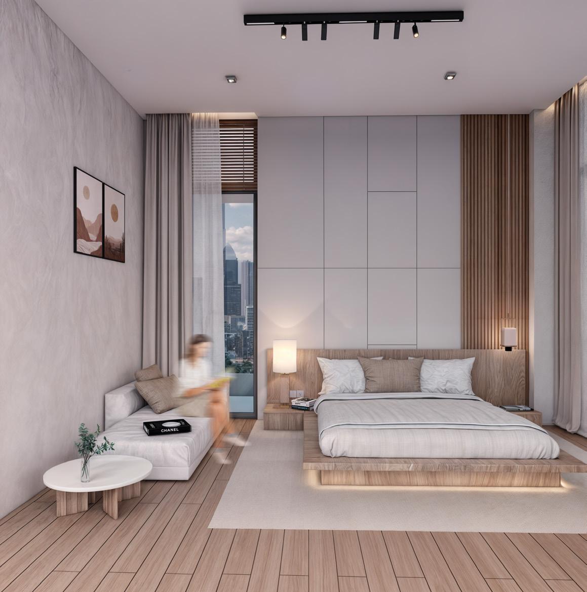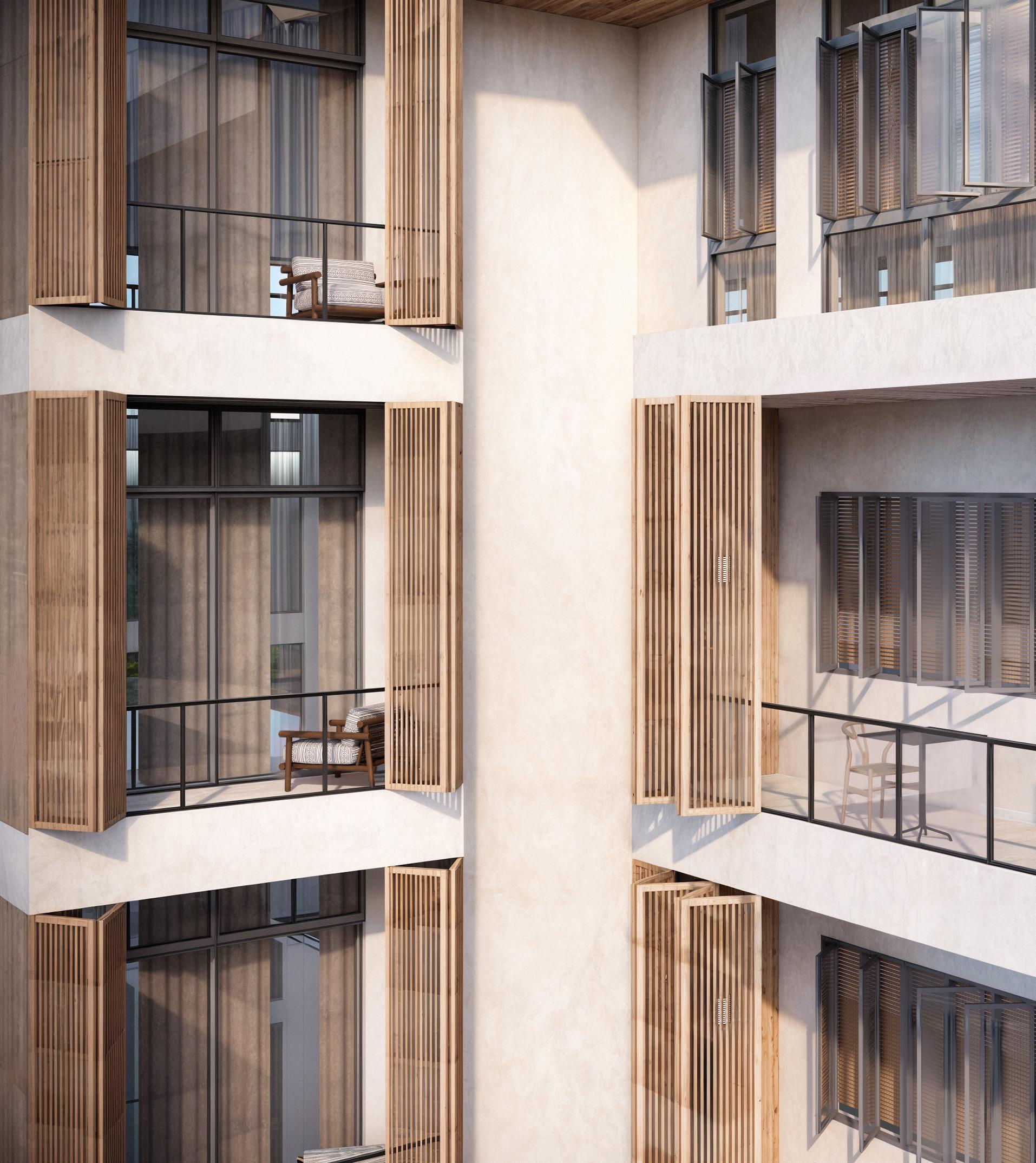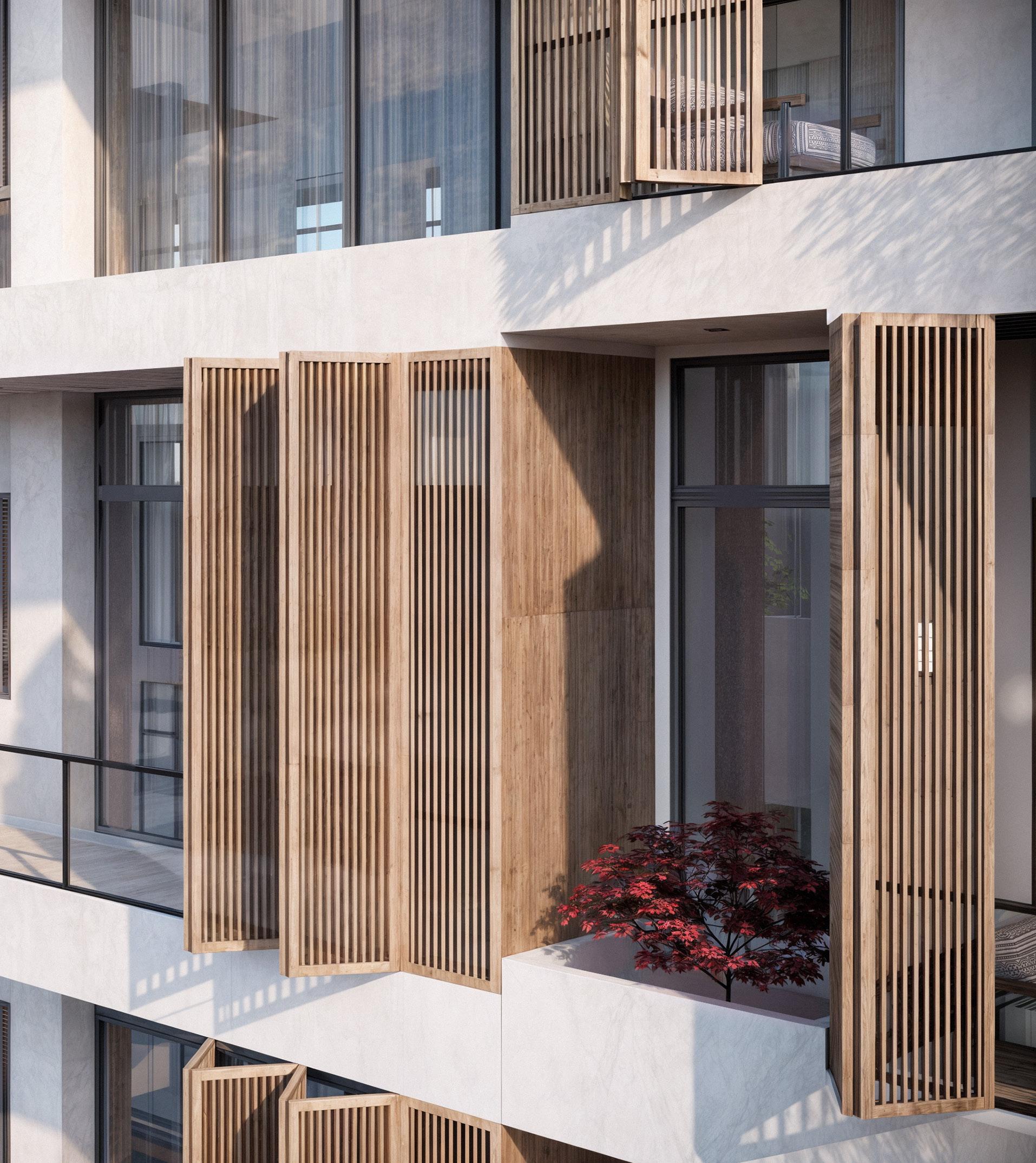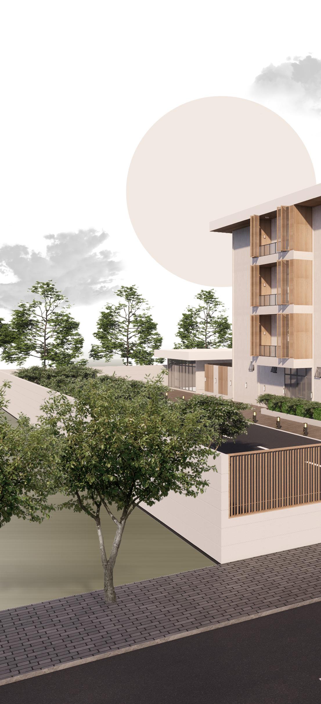 The ideas behind this concpet is to create a japandi-style aesthetic in a building to allow the guest feel ease, providing a comfortable living environment with privacy, allowing residential carriage access, adding shading devices to the facade, designing a duplex style in apartment living, and presenting an outdoor garden.