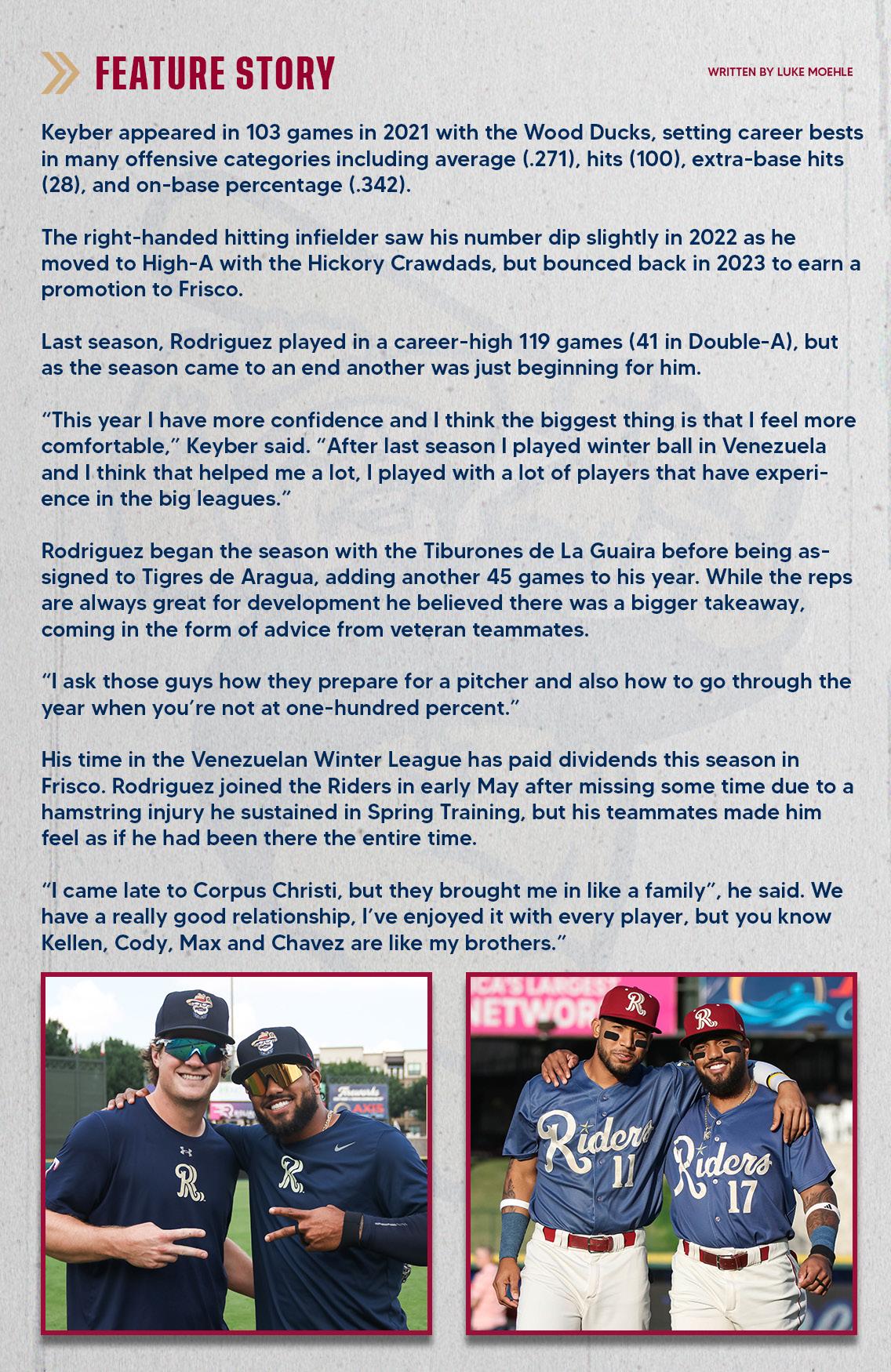 Rodriguez enters his sixth minor league season, signing with the Rangers out of Venezuela and starting in the Dominican Summer League in 2018. He was called up to Double-A in 2023 after Luisangel Acuña was dealt to the Mets organization midseason, and Rodriguez now dons the same #3 jersey that his fellow Venezuelan wore with Frisco. He debuted with the RoughRiders on July 30th, notching an RBI triple in his first game. Keyber finished the season with six extra-base hits over his final 15 games of 2023.