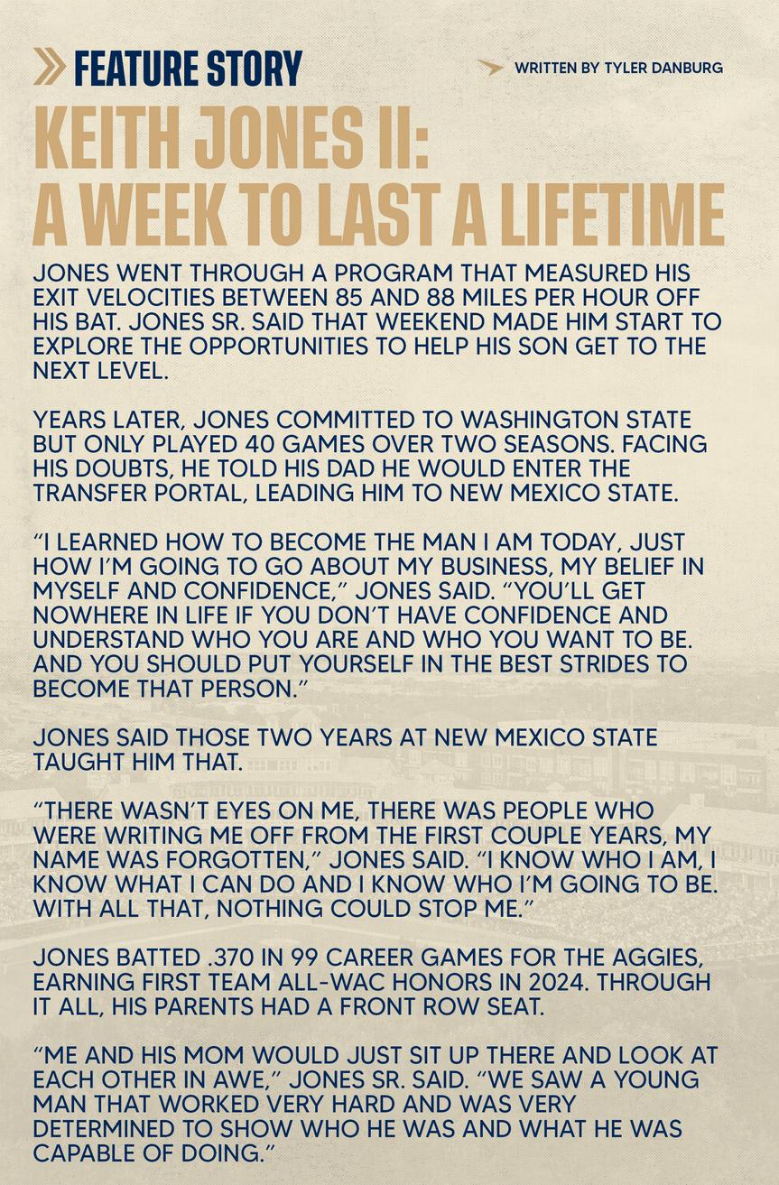 The 23-year-old was assigned to Frisco on July 1 and made an immediate impact, homering in his Double-A debut versus Arkansas With High-A Hub City, Jones ranked fifth in the South Atlantic League in OBP ( 406) and seventh in OPS ( 857), securing June Player of the Month honors. The Rangers made him a ninth-round pick in 2024 out of New Mexico State, where he was a semifinalist for the Dick Howser Trophy st