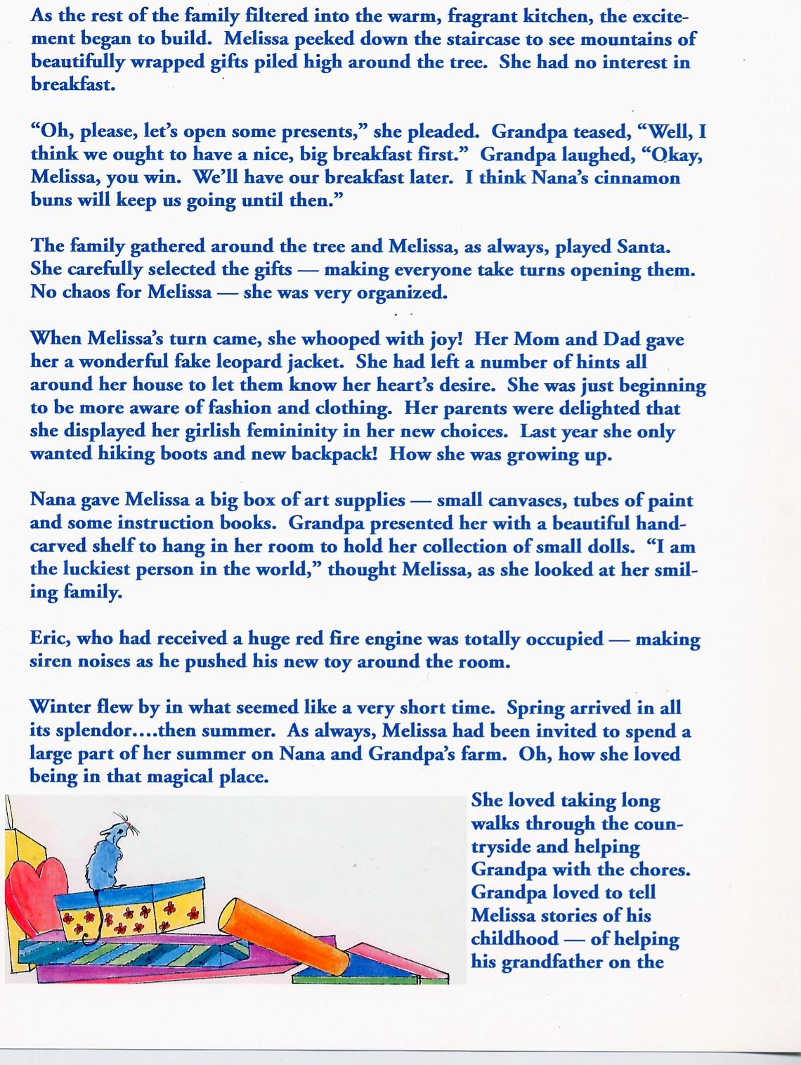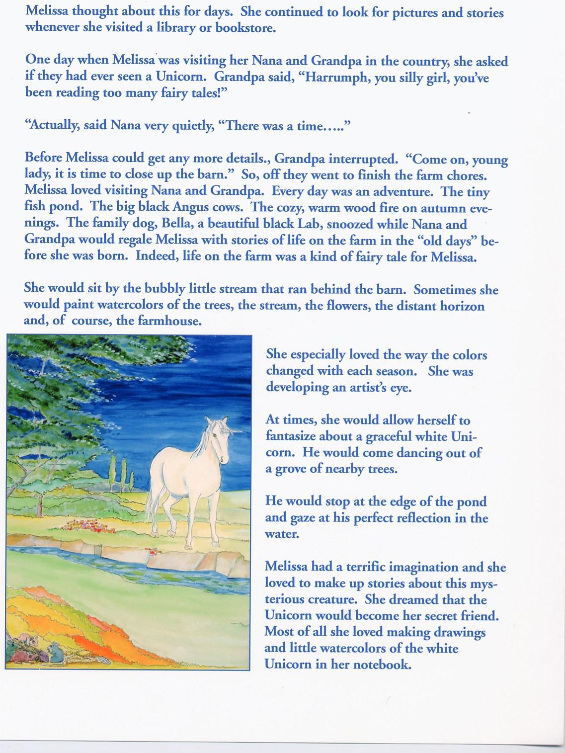 rived, the house was fragrant with cinnamon buns. Melissa opened a gift that made her heart dance: a big box of art supplies from her Nana, and a wooden shelf Grandpa had carved just for her. She used those paints all through the winter, filling her room with color while the snow fell outside. As the year went by, Melissa was a very busy and happy girl. She worked hard on her studies at school, her backpack always full of books. She loved spending time with her friends, sharing secrets under the big oak trees at recess. But her favorite times were the weekends and holidays spent at Nana and Grandpa’s house. She loved the long, golden days helping Nana in the garden. As the air turned crisp and the leaves turned to gold, Melissa helped Nana in the kitchen, carefully rolling out dough for the upcoming Thanksgiving celebration. It was a year full of laughter and the warmth of her family. However, just after that beautiful Thanksgiving celebration, the house grew very quiet. Mom told Melissa that Nana was very sick in the hospital. Melissa knew she had to be brave. Every time she visited, she brought her brightest drawings of the Unicorn to pin on Nana's wall.