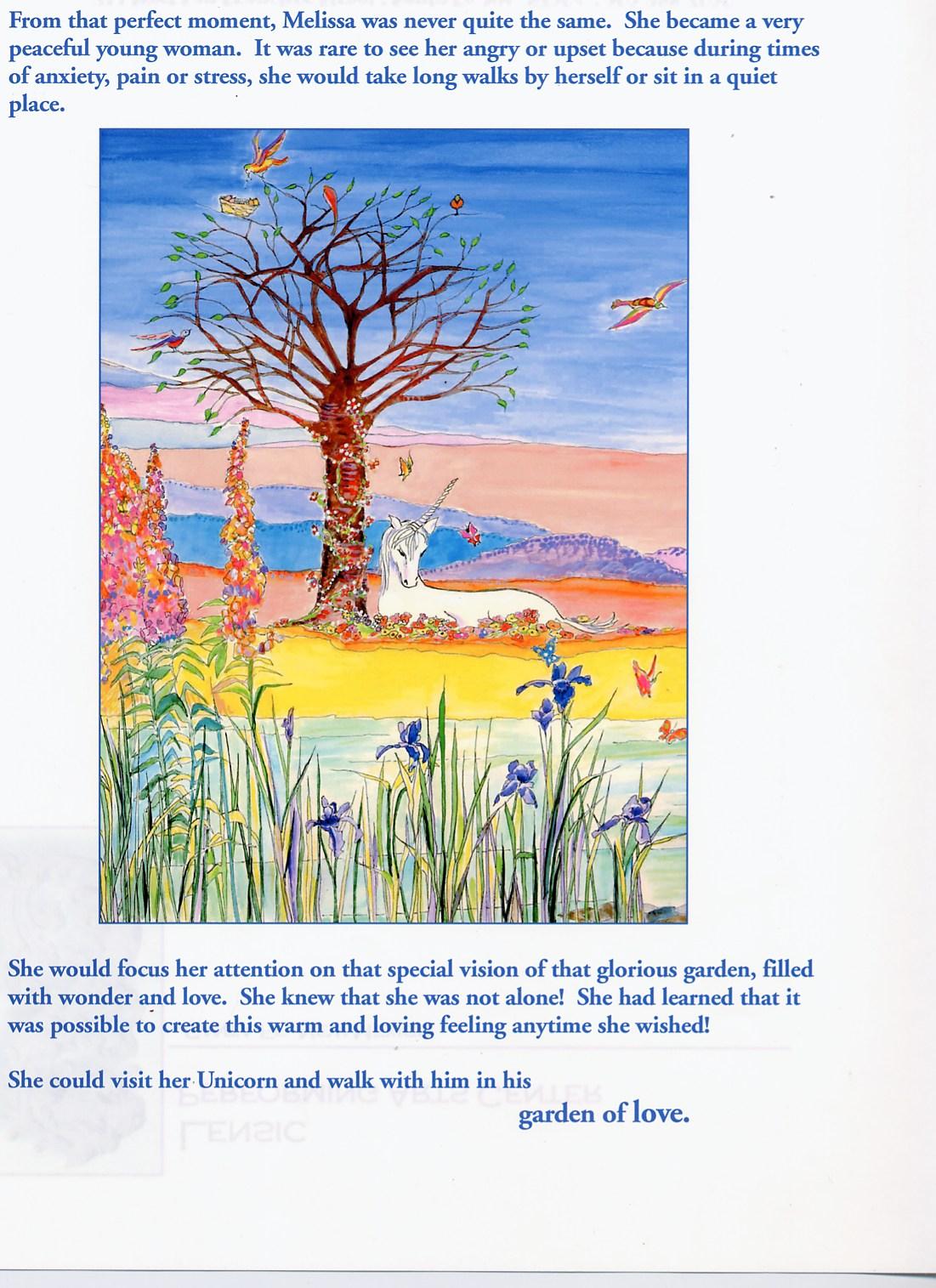One afternoon, Nana took Melissa’s hand and shared a secret. “When I was your age,” Nana whispered, “my grandmother taught me that love is why we are here. One morning, when I was very sad, I looked out my window and saw a beautiful Unicorn. He looked at me with such peace in his amber eyes, and I knew then that love never truly leaves us.” Then came the quiet morning when the doctor took Melissa out into the corridor. He said, ”I think you should know that your Nan is not expected to last the night.” He was very nervous; gazing out the window to avoid Melissa’s questioning eyes. Soon Nana’s long fight with illness was over. She slipped away peacefully, like a soft breath in the wind, and became Melissa’s NanaAngel. Melissa was sad, but she knew her Nana was in a better place.