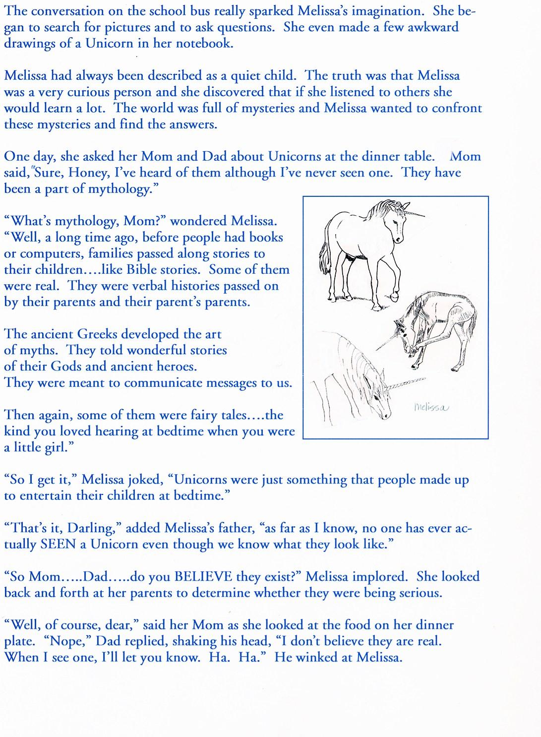 One evening at dinner, Melissa asked, "Mom? Dad?" She took a breath. "Are unicorns real? Or are they just made of pretend?"