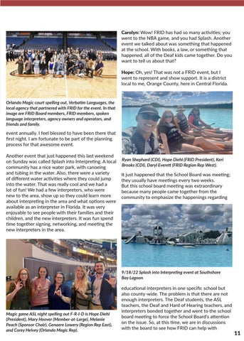 Magic game ASL night spelling out F-R-I-D is Hope Diehl (President), Mary Hoover (Member-at-Large), Melanie Peach (Sponsor Chair), Genaere Lowery (Region Rep East), and Corey Helvey (Orlando Magic Rep). Ryan Shephard (CDI), Hope Diehl (FRID President), Keri Brooks (CDI), Daryl Everett (FRID Region Rep West).resources—for example, gathering information about rates, and job descriptions, to be able to compare what other counties are doing and how they could become more competitive to recruit interpreters to work in the educational setting.