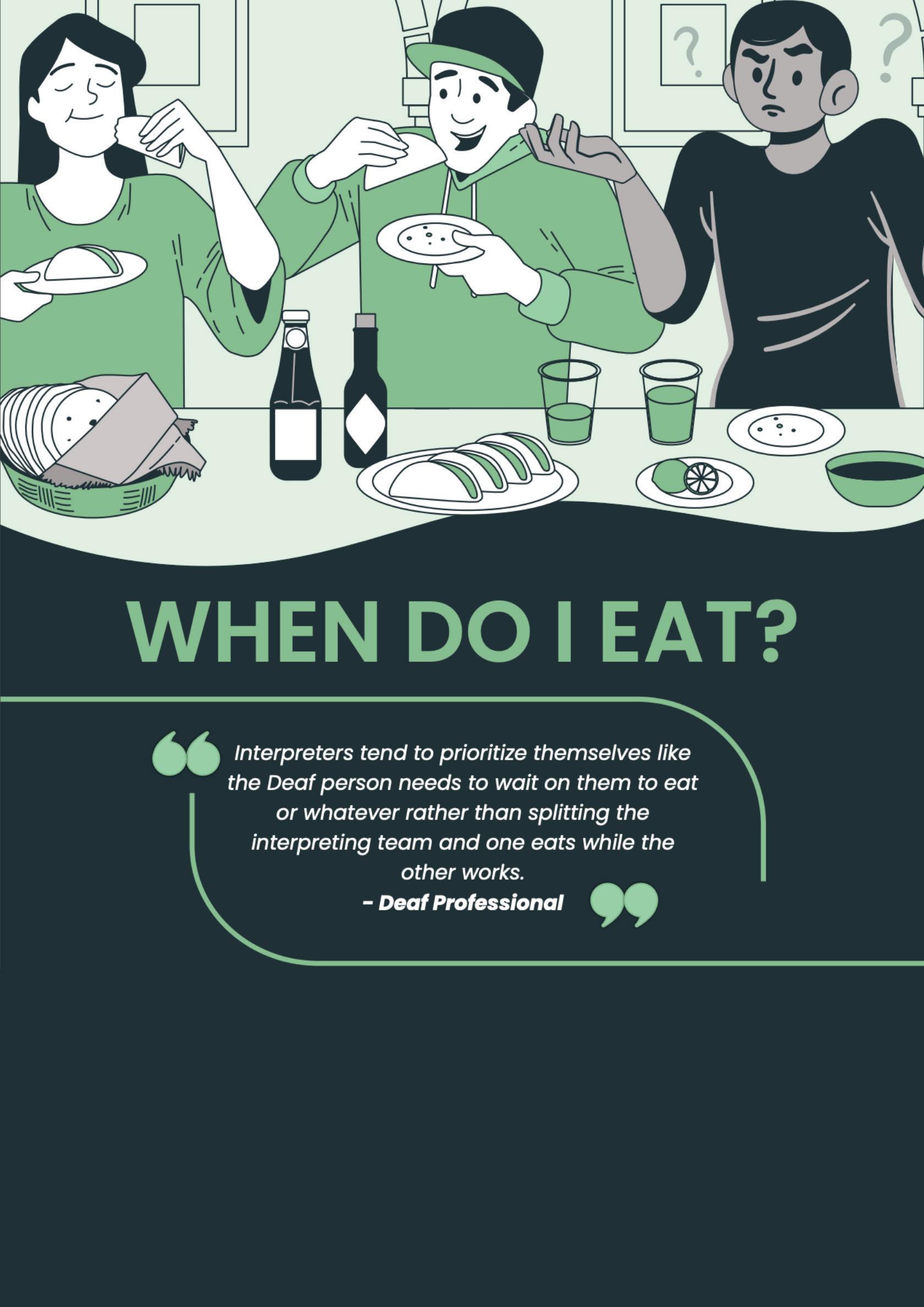 The interpreter stayed with me and at the end of their shift, was relieved and replaced by another highly qualified professional and proficient interpreter and this repeated daily until my release (Optic Neuritis requires a multi-day treatment of IV steroids only administered inhouse, under observation). This was my experience for my entire stay at the hospital. Granted, I live in an area with a large population of Deaf ASL-users and there were other Deaf patients in and out of the emergency room, as well, and the interpreters were tag-teaming between us to provide communication access for our various needs. Seemingly, there was a comparatively well designed system set up that fostered not just effective communication access, but successful communication access.
