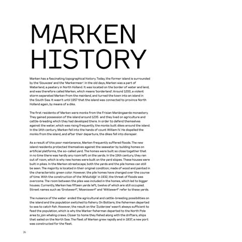 MARKEN HISTORY Marken has a fascinating topographical history. Today, the former island is surrounded by the ‘Gouwzee’ and the ‘Markermeer’. In the old days, Marken was a part of Waterland, a peatery in North Holland. It was located on the border of water and land, and was therefore called Marken, which means ‘borderland’. Around 1200, a violent storm separated Marken from the mainland, and turned the town into an island in the South Sea. It wasn’t until 1957 that the island was connected to province North Holland again, by means of a dike. The first residents of Marken were monks from the Frisian Mariëngaarde monastery. They gained possession of the island around 1235 and they lived on agriculture and cattle-breeding which they had developed there. In order to defend themselves against the water, which was rising frequently, the monks built dikes around the island. In the 14th century, Marken fell into the hands of count William IV. He dispelled the monks from the island, and after their departure, the dikes fell into disrepair. As a result of this poor maintenance, Marken frequently suffered floods. The new island residents protected themselves against the seawater by building homes on artificial platforms, the so-called yard. The homes were built so close together that in no time there was hardly any room left on the yards. In the 19th century, they ran out of room, which is why new homes were built on the yard slopes. These houses were built in pikes. In the Marken streetscape, both the yards and the pile homes can still be seen. The majority is located in their original condition; made of wood and painted in the characteristic green color. However, the pile homes have changed over the course of time. With the construction of the ‘Afsluitdijk’ in 1932, the threat of floods was overcome. The room between the piles was included in the homes, which led to bigger houses. Currently, Marken has fifteen yards left, twelve of which are still occupied. Street names such as ‘Grotewerf’, ‘Moeniswerf’ and ’Wittewerf’ refer to these yards. The nuisance of the water ended the agricultural and cattle-breeding possibilities on the island and the population switched to fishery. On Botters, the fishermen departed to sea to catch fish. However, the result on the ‘Zuiderzee’ wasn’t always sufficient to feed the population, which is why the Marker fisherman departed to the North Pole area to join whaling crews. Closer to home they fished along with the drifters, ships that sailed on the North Sea. The fleet of Marken grew rapidly and in 1837, a new port was constructed for the fleet. 26