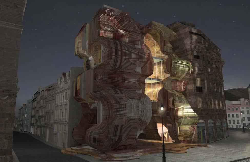 For this project, elements in the alpha images were references taken from the site. Photographs of a candy jar were combined with the alpha images to create an abstract form. The jar gives the building its main shape, characterized by a sharp curvature profile.