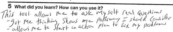 “This tool allows me to ask myself real questions - got me thinking, shows me pathways I should consider - allows me to start an action plan to fix my problems.”