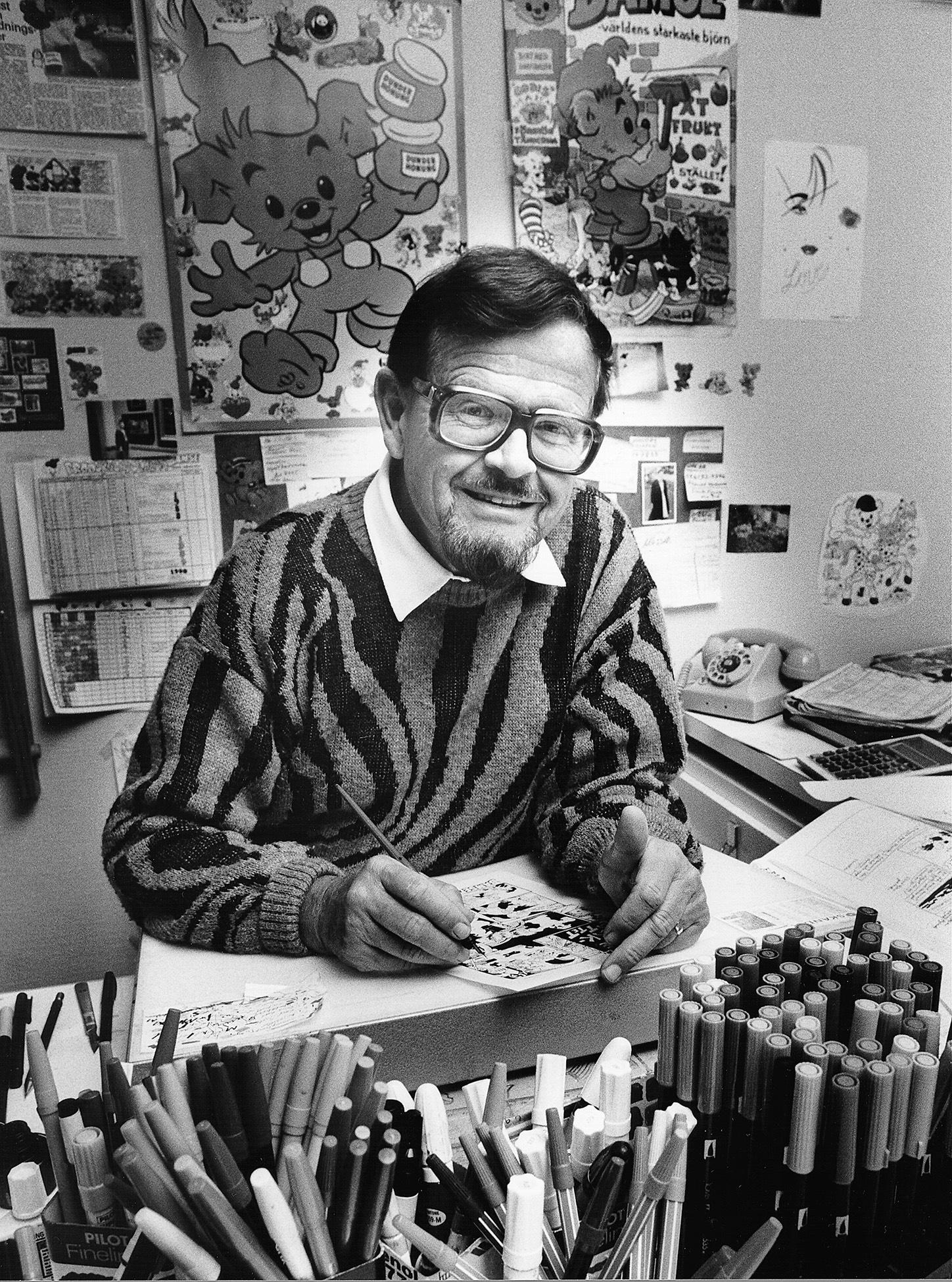 Rune Andréasson was born in Gothenburg in 1925. His interest for drawing comics started early and he was still in school when the weekly magazine Allers started to publish his illustrated stories. His first comic strip Brum was about a nice litle bear cub that lived in the Swedish forest. Allers started to publish Brum every week in 1943 and the year afer Brum was also published weekly in Göteborgsposten. Tis continued on until 1967. Rune Andréasson did everything himself; wrote stories and made cartoons.