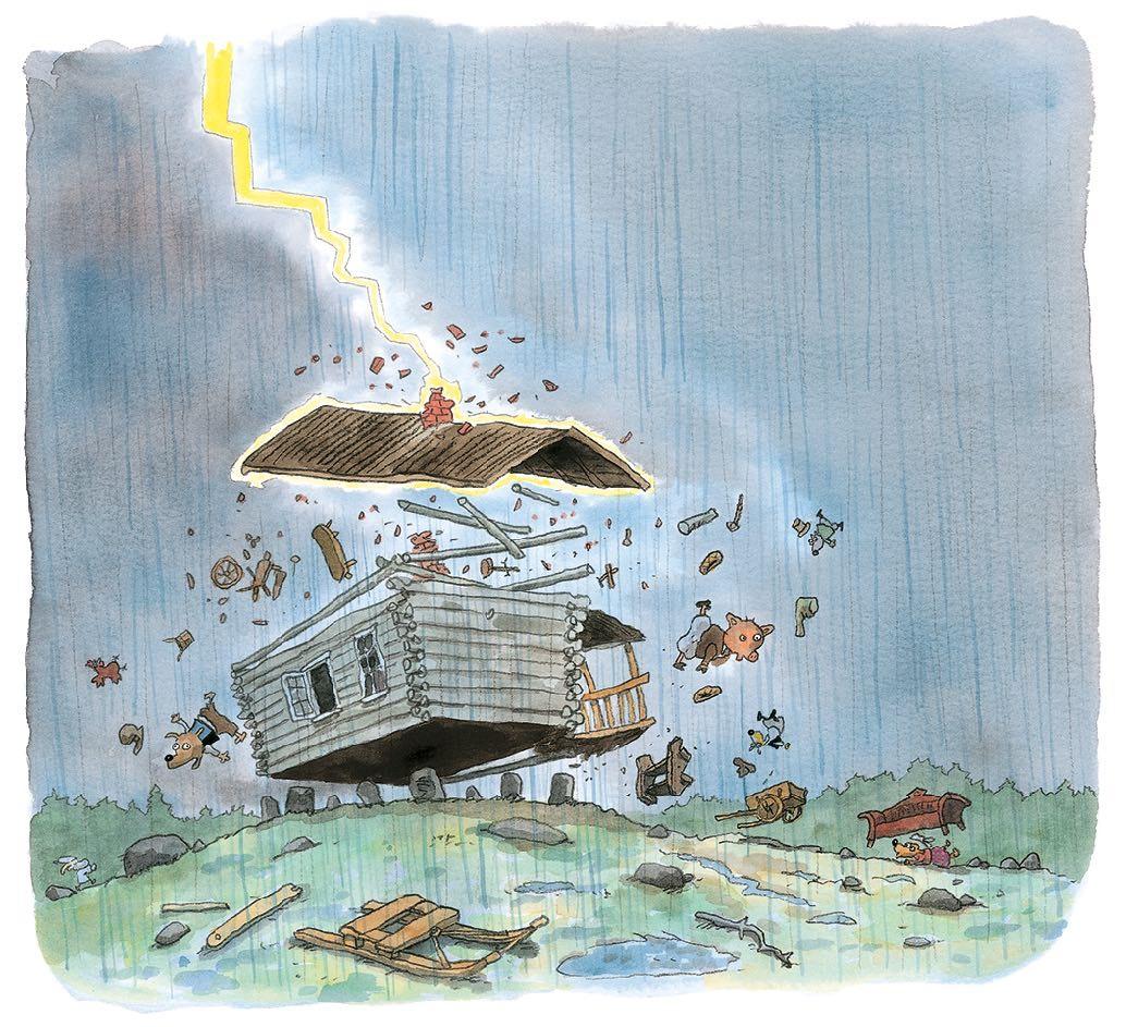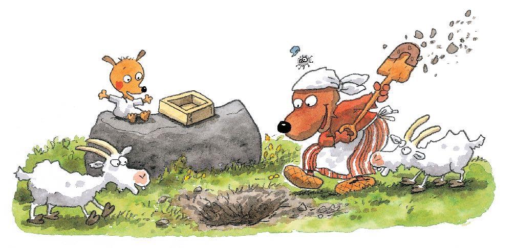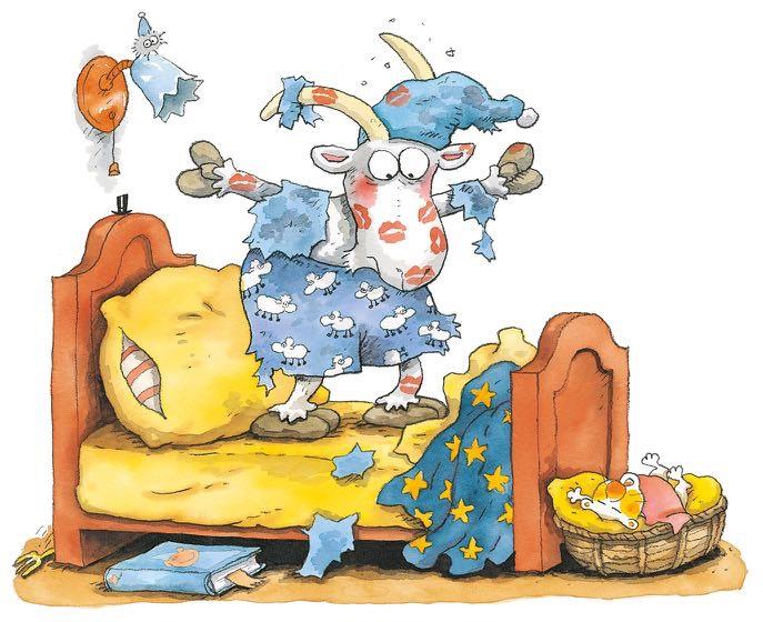 Troughout the years, seeking and finding the sleepwalking goat Mr. Cluterbuck among the colorful illustrations has been a continuous theme in Kunnas’ children’s books. Mr. Cluterbuck is blissfully unaware of his reputation as the busiest sleepwalker in town. He is a timid gentleman by day, and a fearless, sleepwalking adventurer at night. But his nightly ramblings always end well, mostly thanks to the assistance of his loyal companion, Guinea Pig Gus.