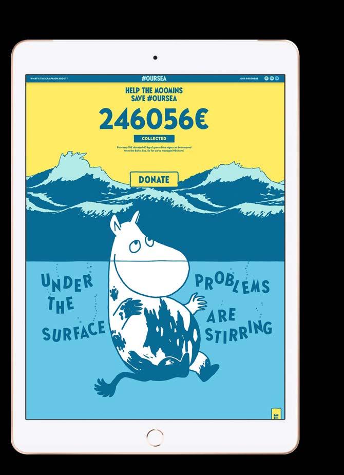 Tove Jansson published the first Moomin story 75 years ago, “The Moomins and the Great Flood”. We are celebrating this anniversary together with Moomin Characters and over 150 partners and licensees in the CSR campaign #OURSEA. Together we are aiming to collect one million euro to our campaign partner John Nurminen Foundation to support their work to save the Baltic Sea; its water, life and heritage.