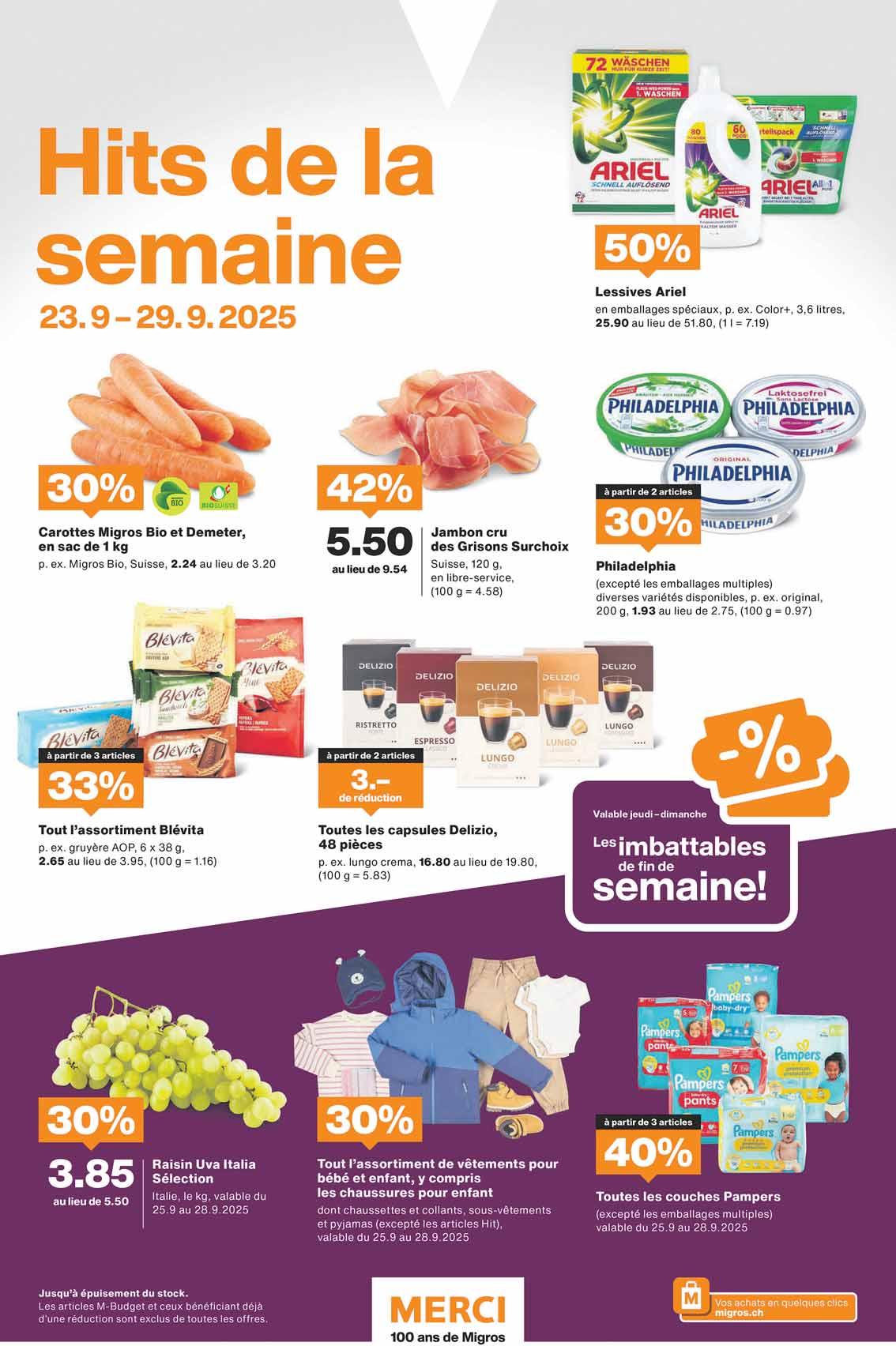 * Sauf montres, bijoux, lunettes de soleil ou de lecture et Coop Prix Garantie. Offre valable jusqu’au 28.9.2025. Non cumulable avec d’autres rabais ou avantages. La disponibilité de certaines offres peut être restreinte temporairement en raison de la situation actuelle sur les marchés d’a pprovisionnement.