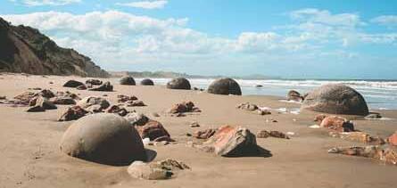 Si les Moeraki Boulders font la couverture de nombreux guides touristiques, c’est que ces rochers sphériques de grande taille constituent bien l’un des plus étranges paysages de Nouvelle-Zélande. Les blocs les plus imposants pèsent plusieurs tonnes. Certains visiteurs y voient des œufs de dinosaures. Il s’agit en fait de dépôts de calcites autour de noyaux de boue fossilisés. Ils ont commencé à se former il y a environ 60 millions d'années, et on estime que les plus gros d’entre eux ont mis près de 40 siècles pour atteindre leur taille actuelle. On les trouve le long d'un tronçon de la Koekohe Beach dans la baie d'Otago, entre Moeraki et Hampden, sur l'Ile du Sud. Cathedral Cove est la baie incontournable. Considérée comme l'une des plus photogéniques du pays, sa plage a servi de décor au film «Le Monde de Narnia». Environ 45 minutes de marche dans un paysage paradisiaque mènent à une voûte grandiose accessible à marée basse.