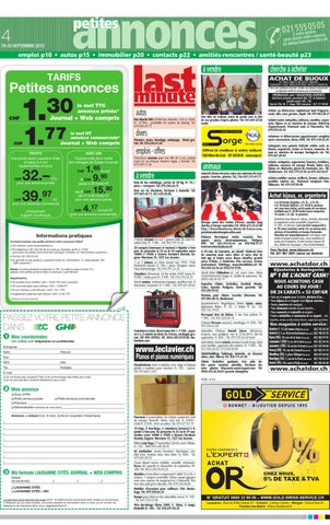 • Par téléphone: 021 555 05 05 du lundi au vendredi, de 8h à 17h30 (sauf pour les petites annonces des rubriques «Amitiés» et «Rencontres coquines») • Par fax: 021 555 05 02 • Au guichet ou par poste à: Lausanne Cités, av. d’Echallens 17, case postale 150, 1000 Lausanne 7