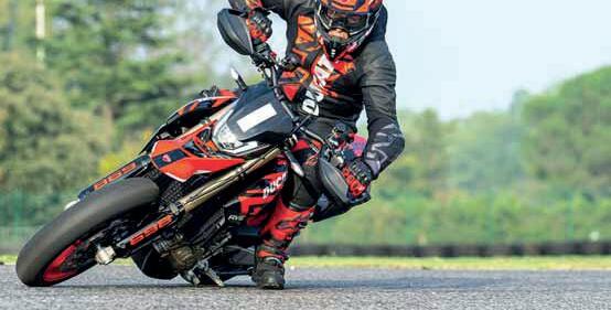 Mono 698 cc, 57 kW-77,5 ch. Couple 63 Nm. Bte 6 Quickshift. Cadre tubulaire, fourche AV inv. Marzocchi 45 mm, régl. Bras oscil. AR alu Sach, régl. Débat. AV 215 mm, AR 240 mm. Freins: AV 330 mm Brembo, AR 245 mm. ABS Bosch cornering. Poids 151 kg. Haut. selle 904 mm.