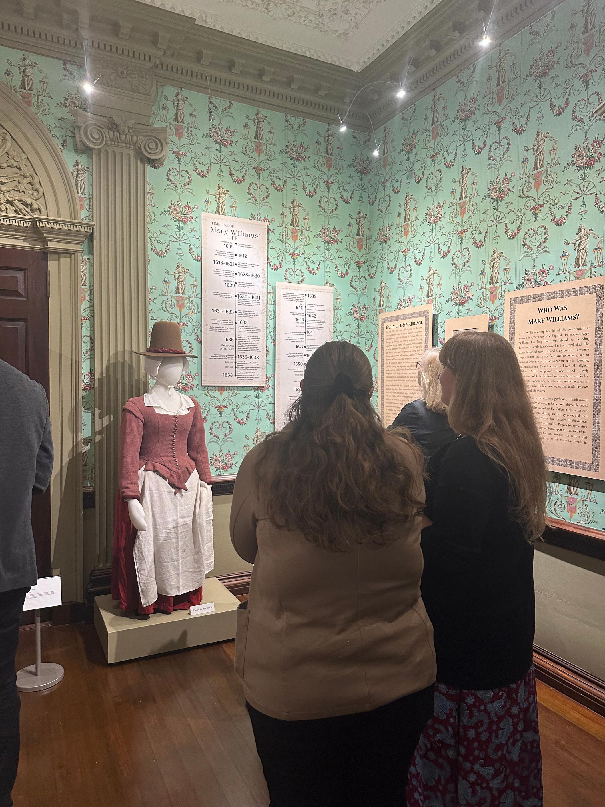 Based on extensive research by Dr. Charlotte Carrington-Farmer, including her article, “More Than Roger’s Wife: Mary Williams and the Founding of Providence,” the exhibit features objects from the RIHS collection, as well as loans from Plimoth Patuxet Museums and the Roger Williams Family Foundation. Using panel text and enlarged visuals of historic documents and maps, visitors uncover Mary’s story and how she kept Roger’s “lively experiment” alive, especially while he traveled throughout the region and across the Atlantic