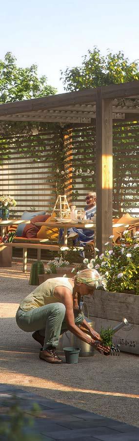 Ta med dig en kopp kaffe till innergården och hitta lugnet i grönskan. Här kan du sitta i pergolan omgiven av träd, buskar och planteringar.