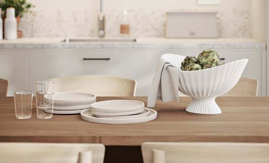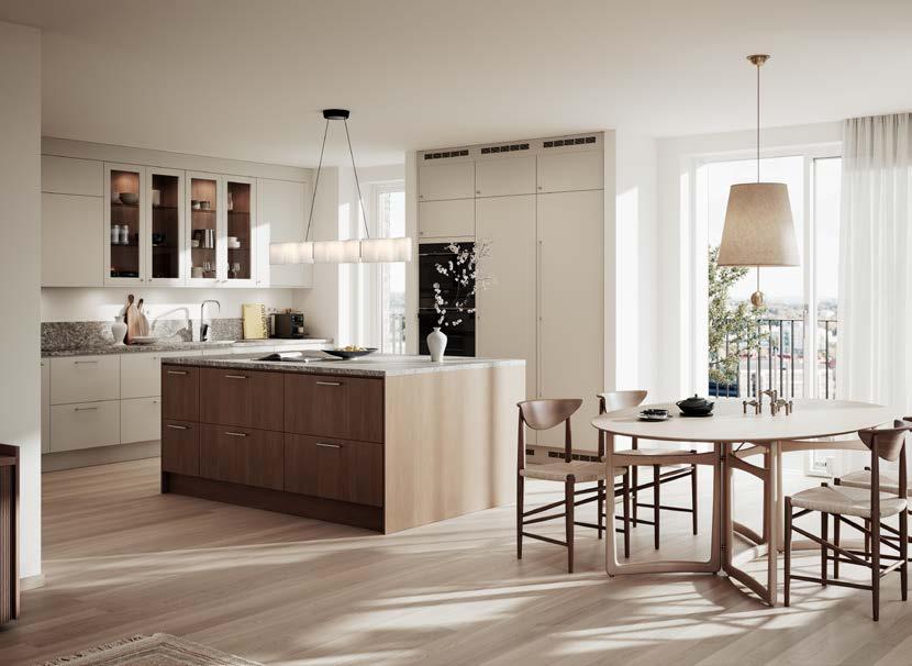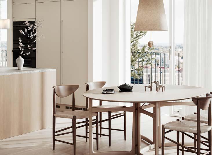 I köket finns gott om plats att samla familj och vänner för middagar och umgänge. Stora fönster och tvåstavsparkett i vitpigmenterad ek ger en ljus och harmonisk atmosfär.