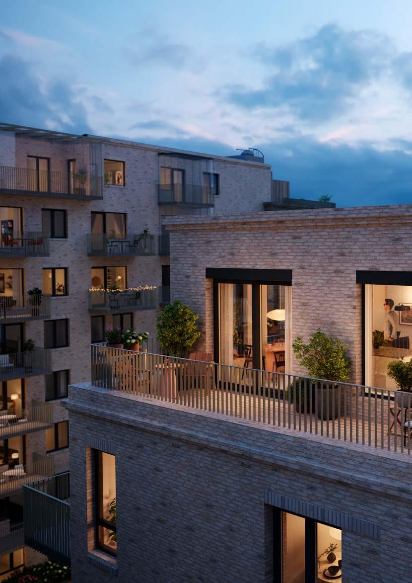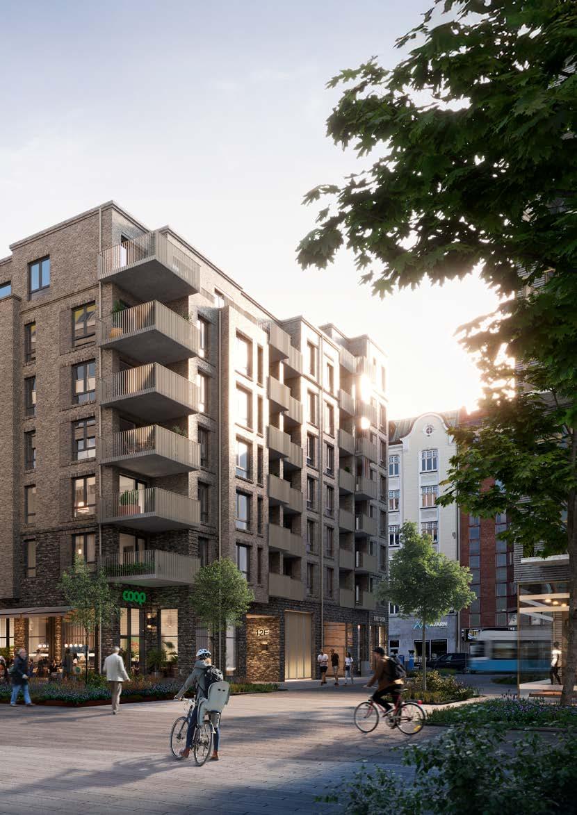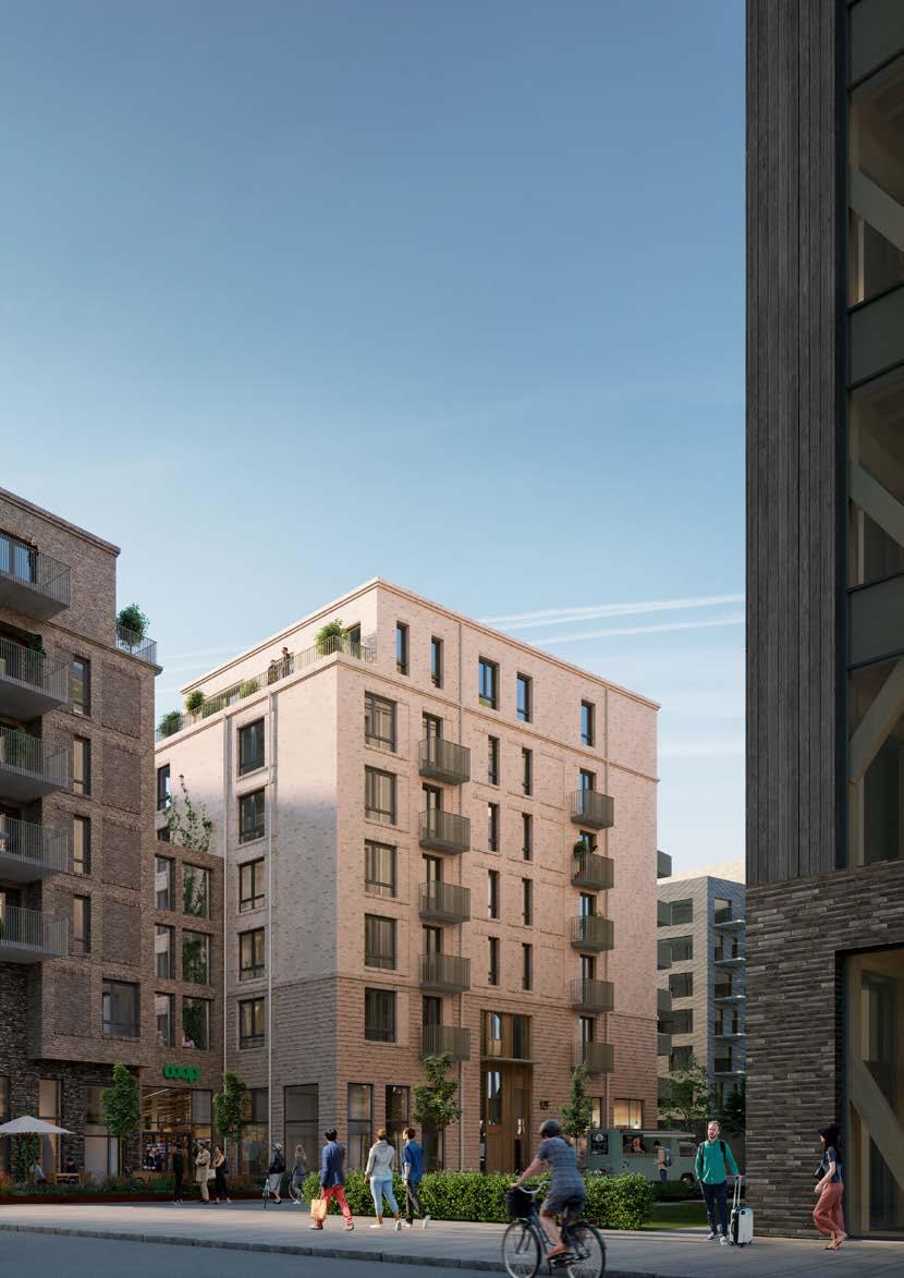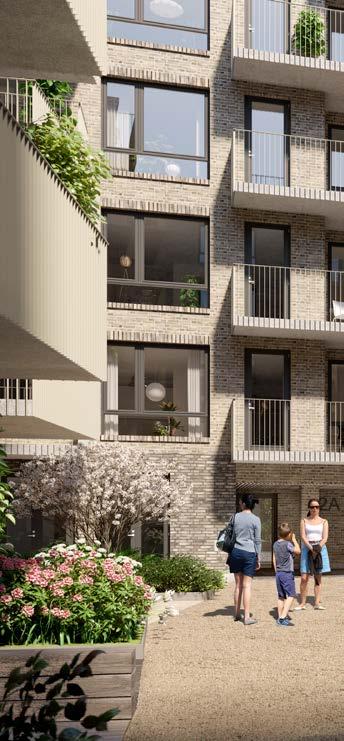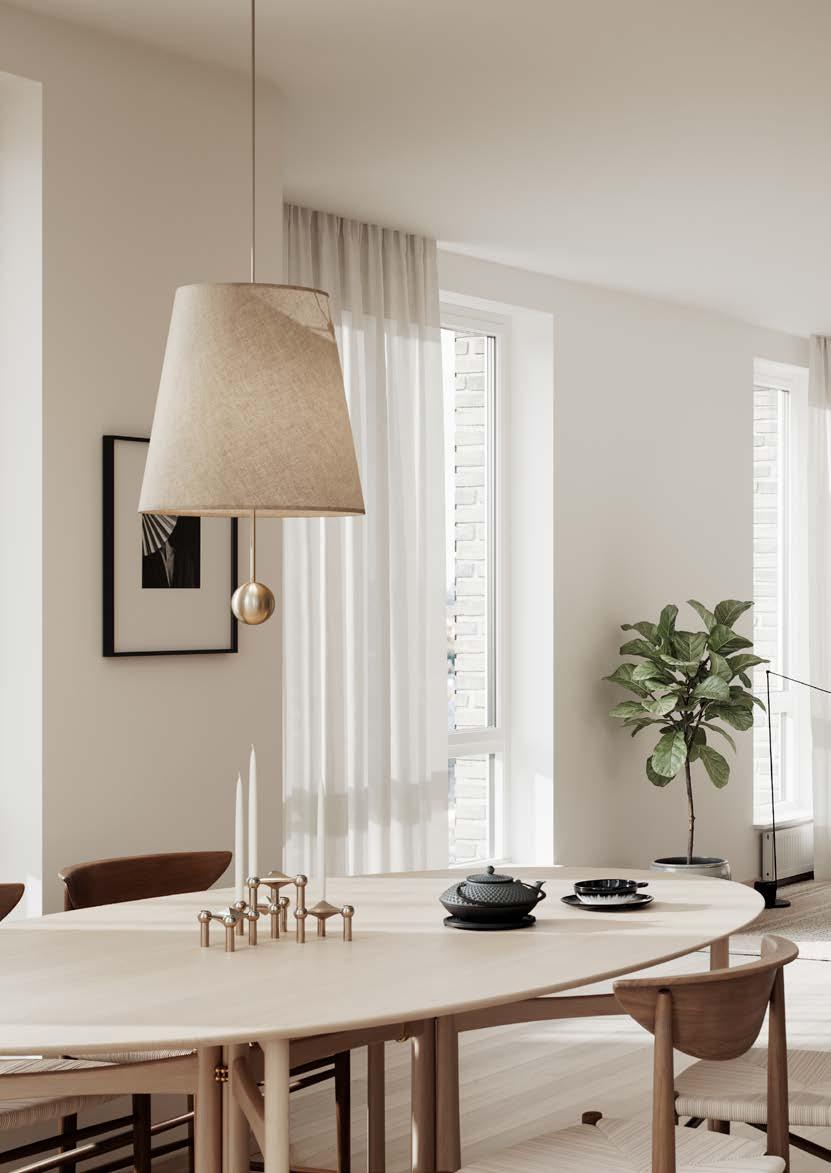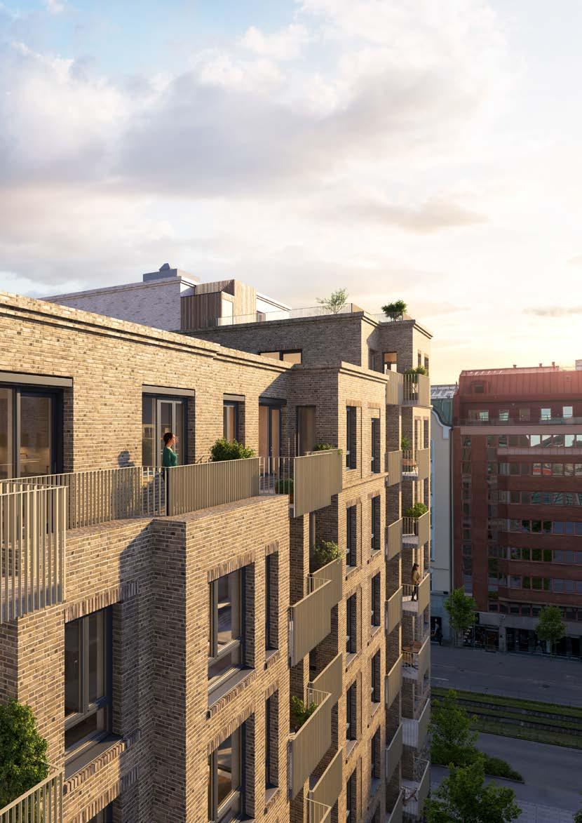 med utblickar och ljusinsläpp, särskilt i vinklar där det annars kan vara svårt att få in dagsljus. De flesta lägenheterna har fönster i minst två väderstreck, vilket ger en fin känsla av rymd och ljus. För de större lägenheterna har vi lagt mycket energi på att skapa tydliga zoner, med en mer publik del för vardagsrum och kök där man umgås, och så en mer privat del med sovrum och bra förvaring i stora klädkammare och garderober.