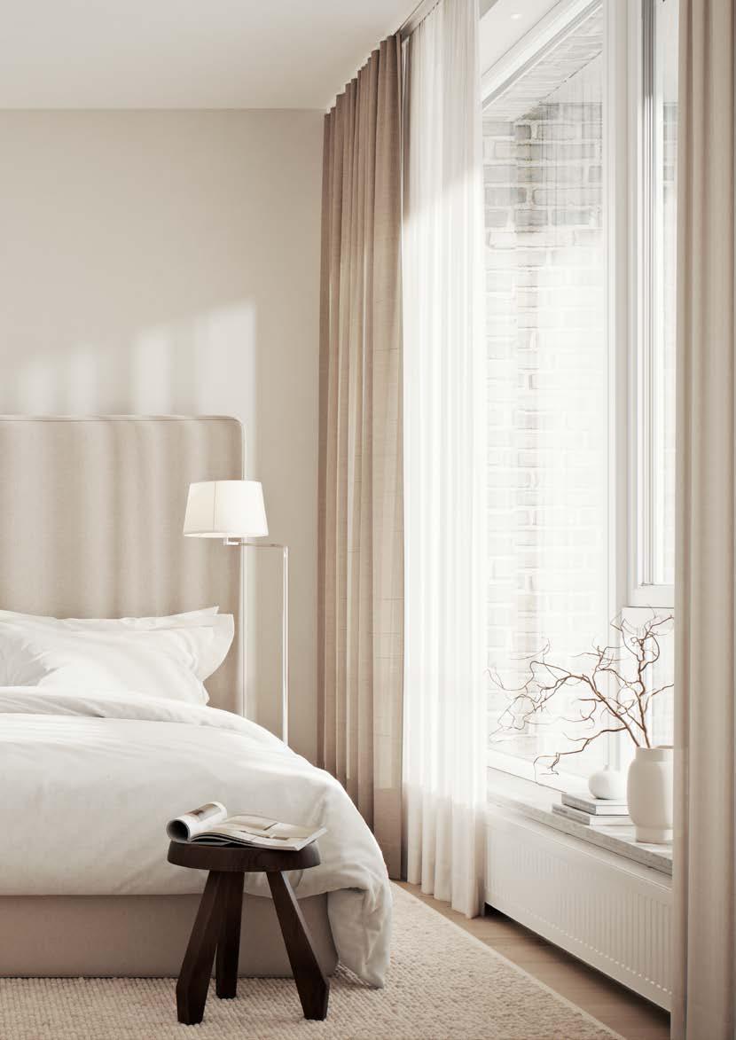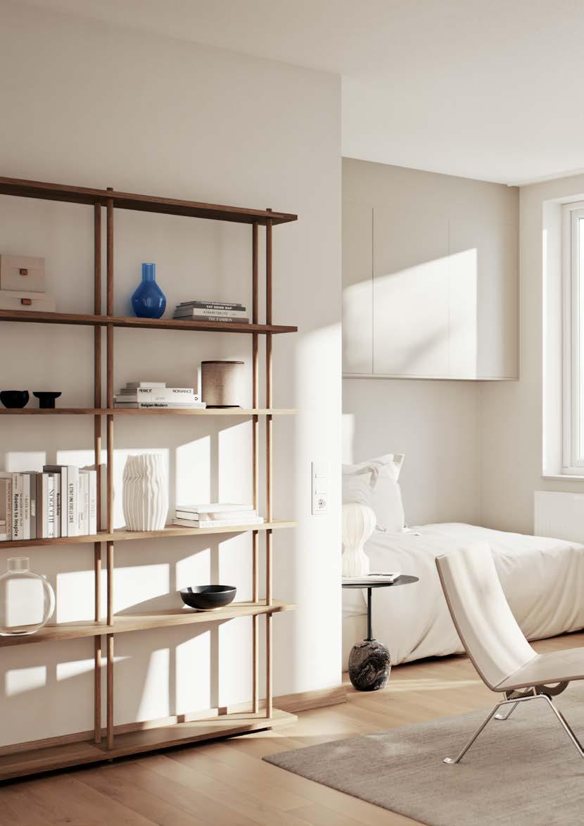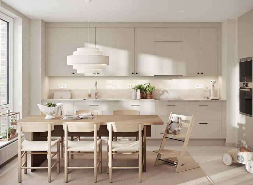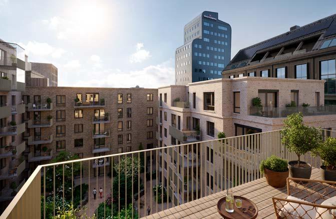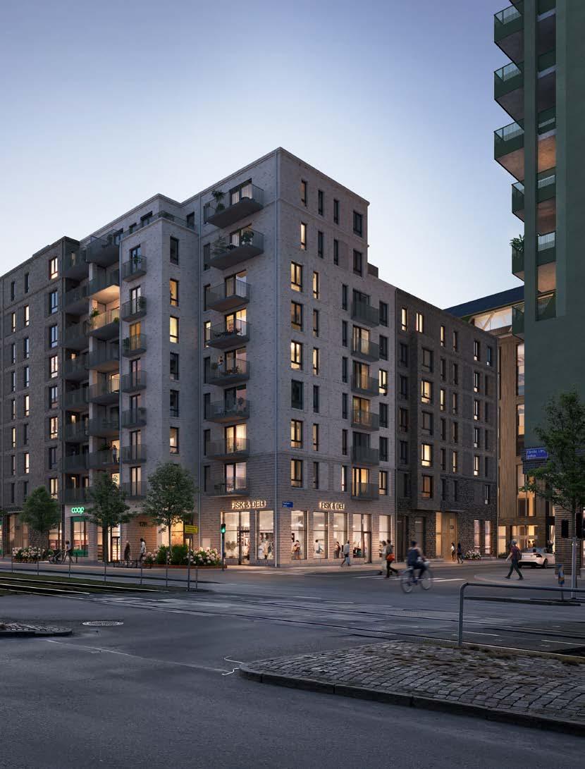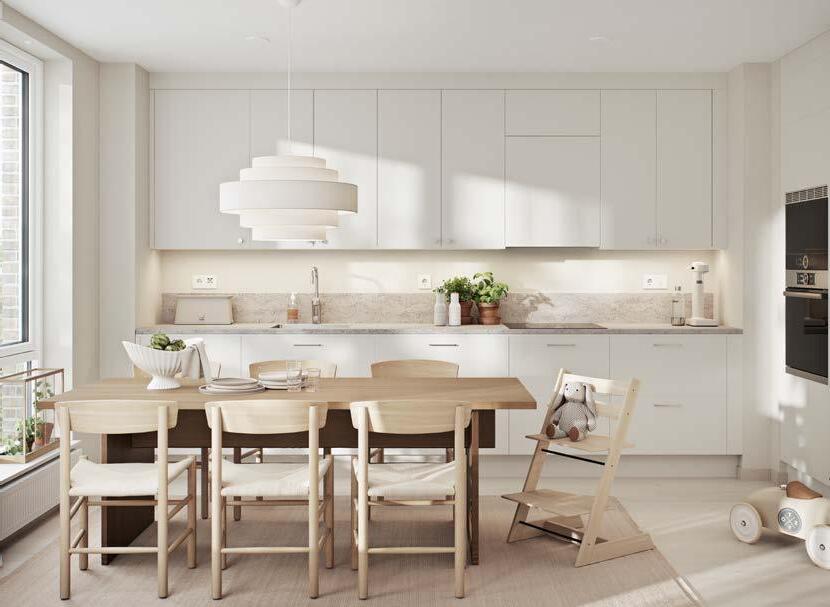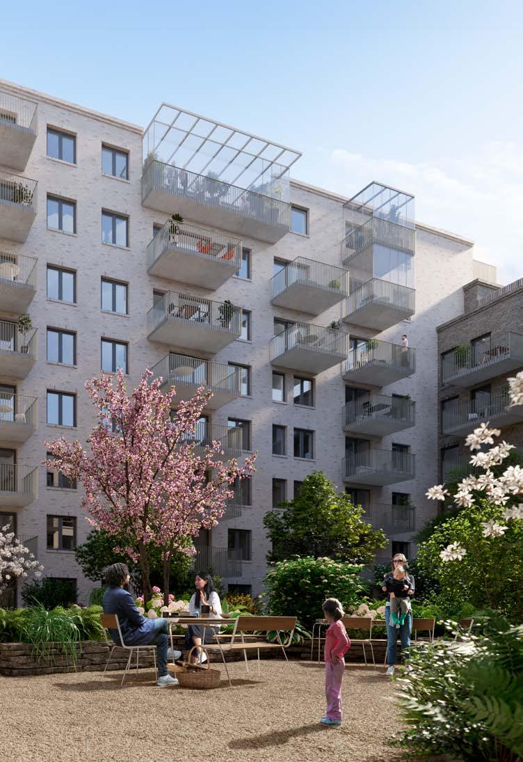 med utblickar och ljusinsläpp, särskilt i vinklar där det annars kan vara svårt att få in dagsljus. De flesta lägenheterna har fönster i minst två väderstreck, vilket ger en fin känsla av rymd och ljus. För de större lägenheterna har vi lagt mycket energi på att skapa tydliga zoner, med en mer publik del för vardagsrum och kök där man umgås, och så en mer privat del med sovrum och bra förvaring i stora klädkammare och garderober.