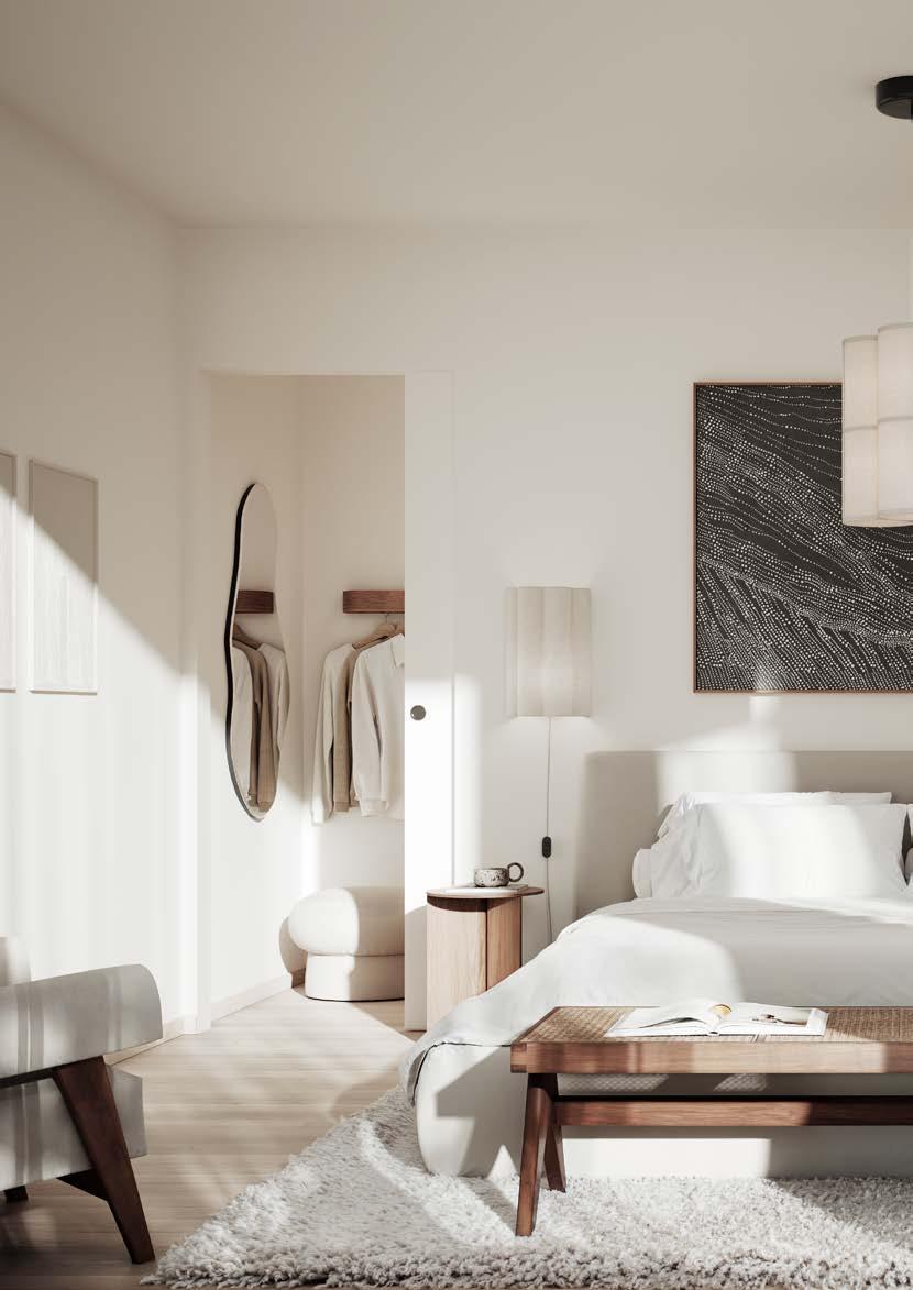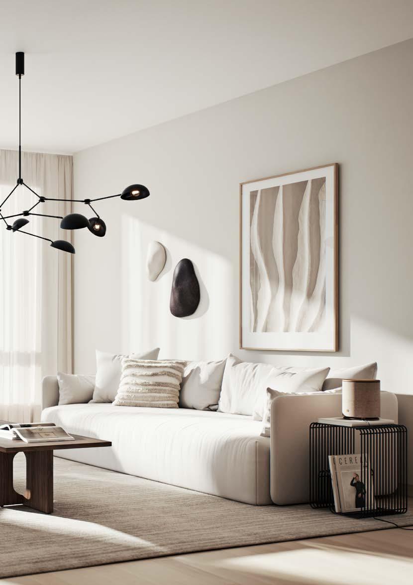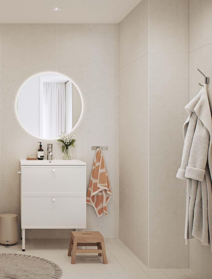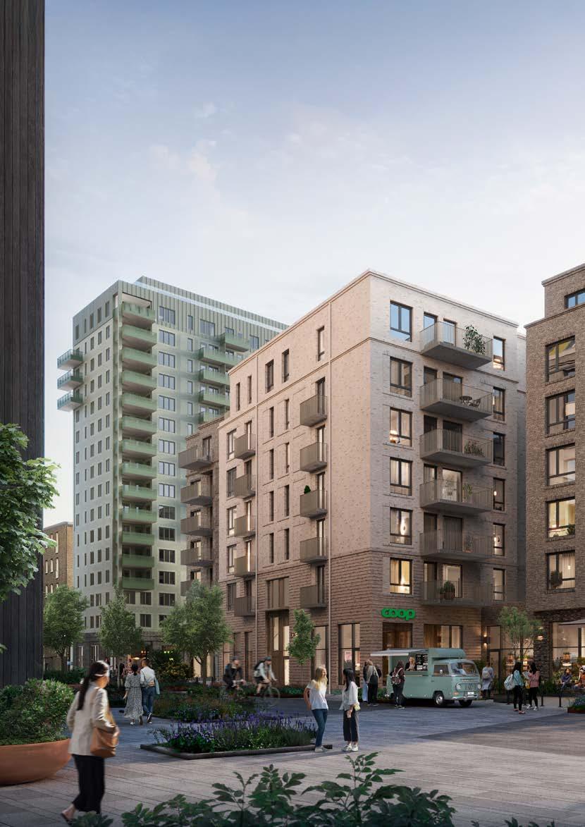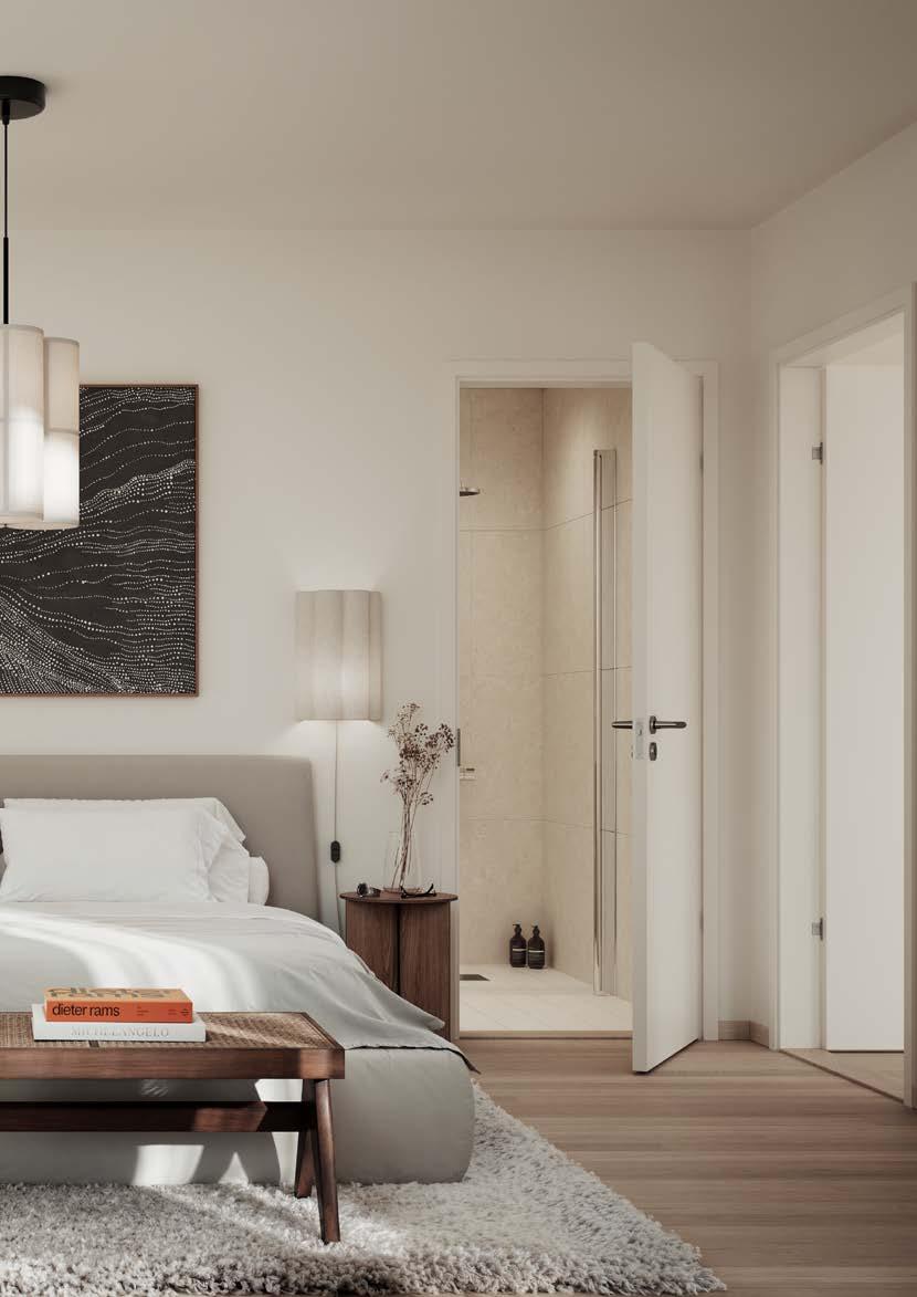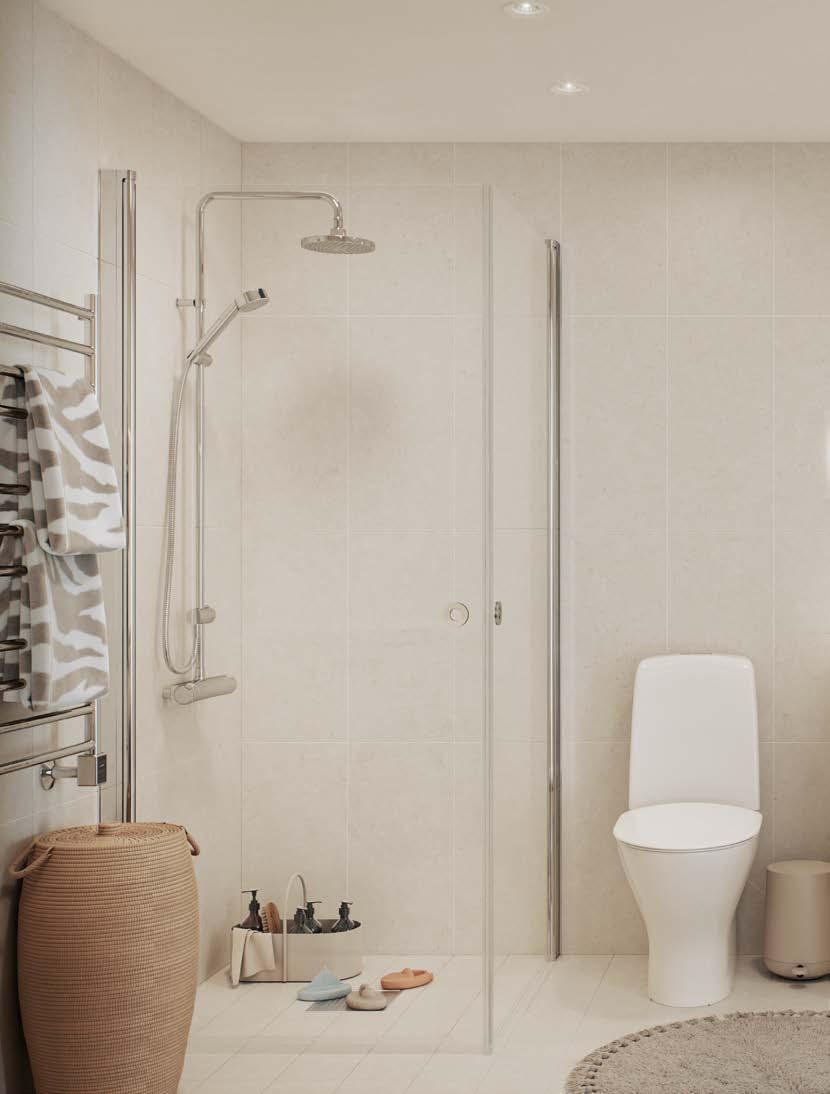 med utblickar och ljusinsläpp, särskilt i vinklar där det annars kan vara svårt att få in dagsljus. De flesta lägenheterna har fönster i minst två väderstreck, vilket ger en fin känsla av rymd och ljus. För de större lägenheterna har vi lagt mycket energi på att skapa tydliga zoner, med en mer publik del för vardagsrum och kök där man umgås, och så en mer privat del med sovrum och bra förvaring i stora klädkammare och garderober.