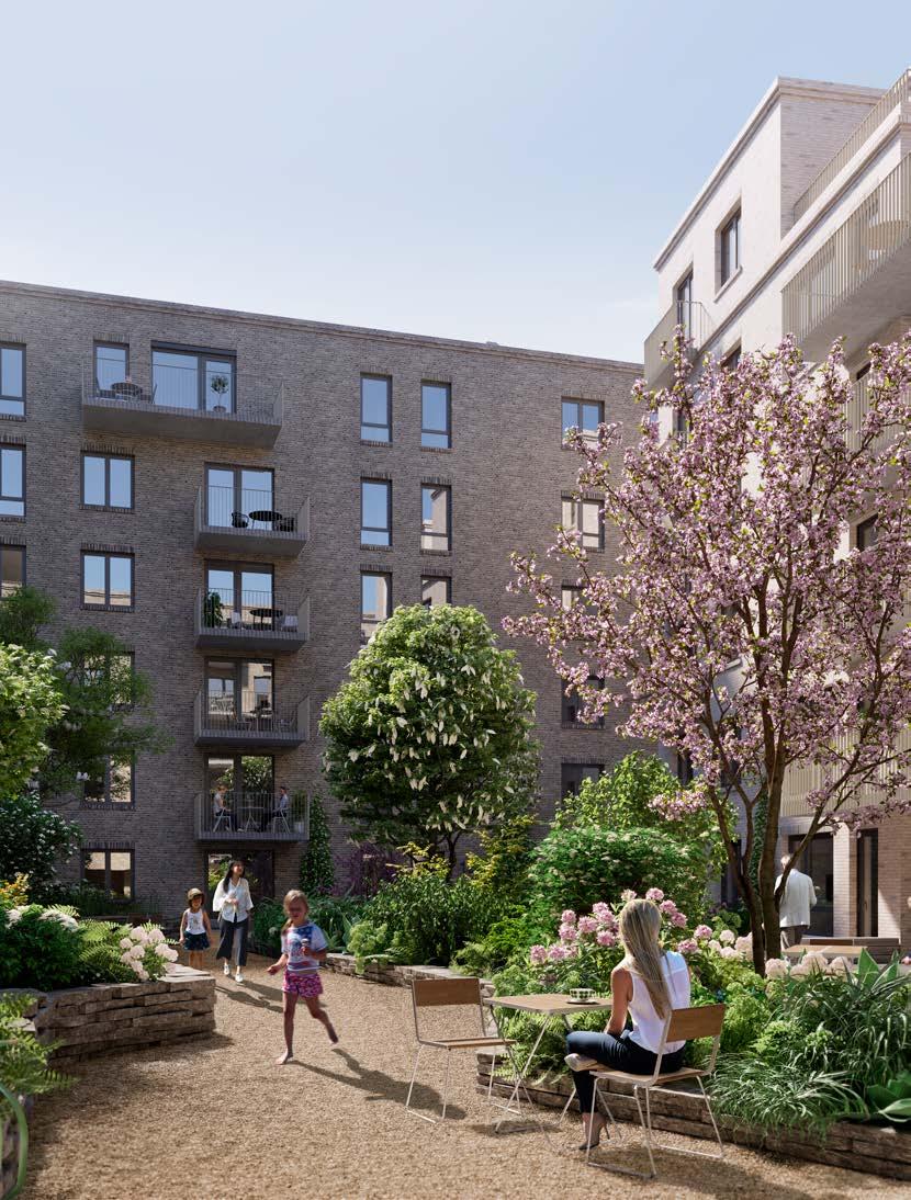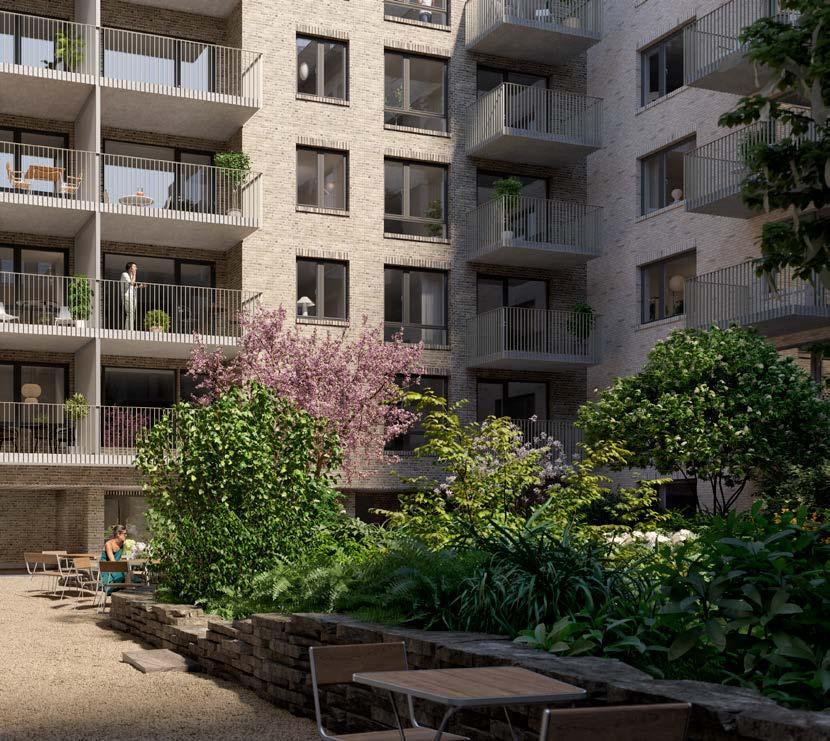 Väl skyddat en våning upp från gatuplan ligger innergården, exklusivt för de boende. Den är kvarterets trygga hjärta, en lugn oas mitt i stadens puls med plats för grönska och återhämtning. Tack vare den variationsrika utformningen kan många vistas på gården samtidigt, utan att man sitter på varandra.