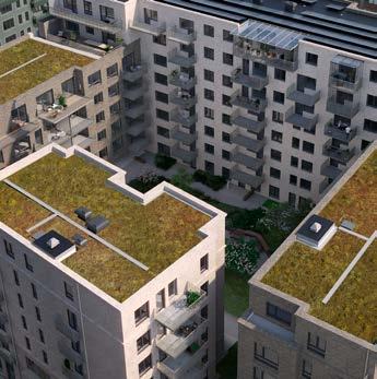 • Skapa grönytor och gröna tak med sedumväxter på huskropparna