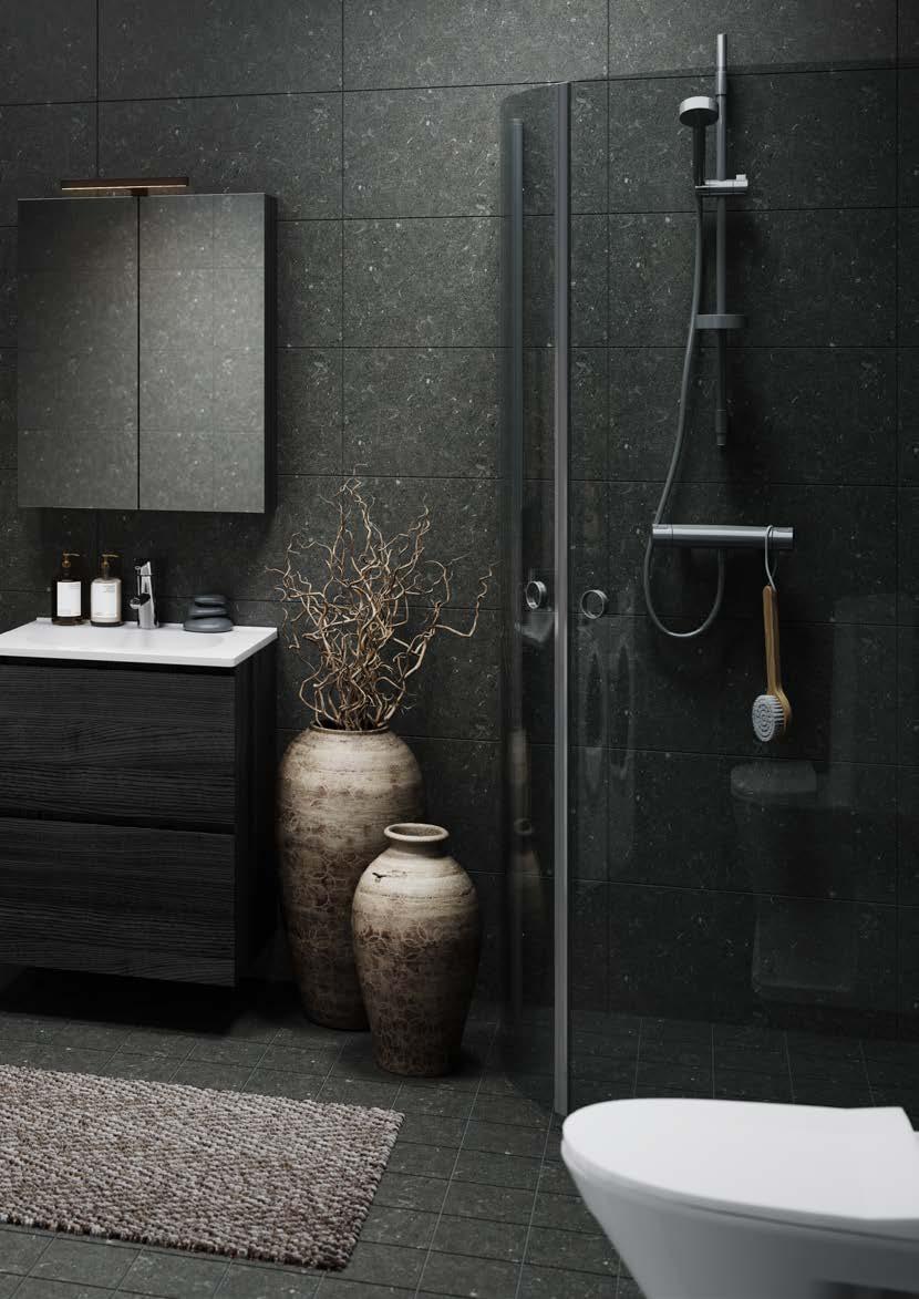 Här kan du välja en elegant stil med marmormönstrat kakel och mässinghandtag, eller skapa en trendig känsla med kakel i stående sättning och med svarta handtag. Värme skapar du genom att addera ting med tyngd, såsom material i trä, skinn, keramik och sten. Sirliga snittbuketter och skira glas kan ge en lätthet i den annars mörka stilen. Här skapas kontraster och du kan leka med färger som blått och brända orange toner.