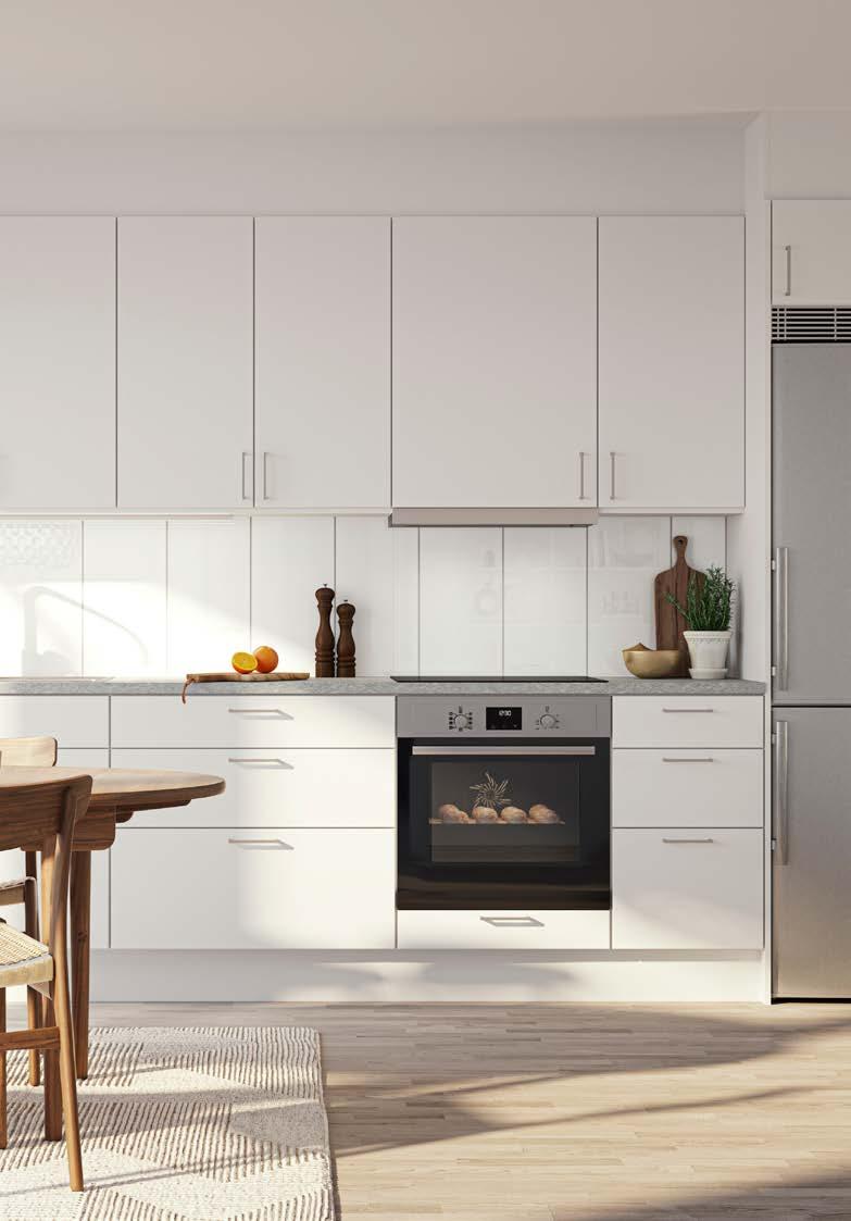 Köken finns i tre olika färger: Vit, Sand och Grön. Varje lägenhet har en förutbestämd färg, så när du väljer en viss lägenhet blir det samtidigt ett val av vilken färg du får i köket. Du hittar inredningsstilen på planritningarna högst upp till häger på varje sida.