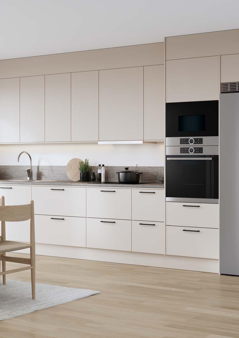 Det här ser du Lucka: Sand Handtag väggskåp: Push to open Handtag bänkskåp: Mattsvart