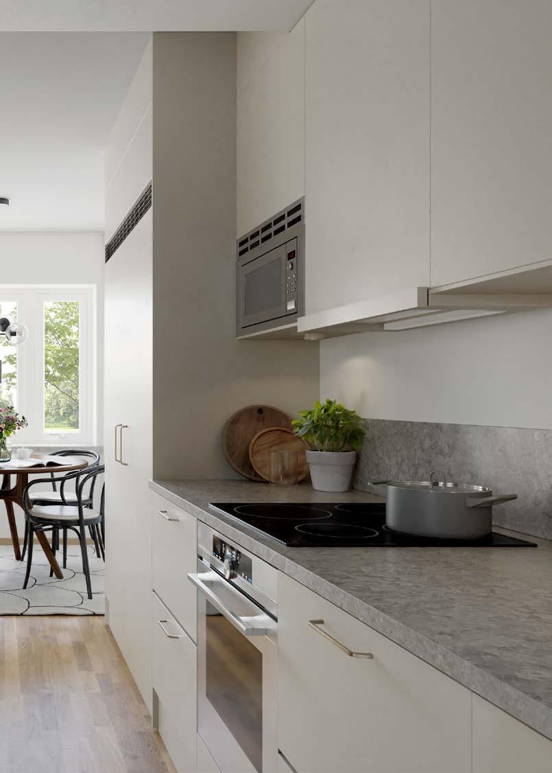 Köken är lika genomtänkta som de är inspirerande att laga mat i. En perfekt blandning av funktionell förvaring, energisnåla vitvaror och arbetsyta att breda ut sig på. En annan fördel är den strategiska placeringen av köksfönstren. Härifrån har ni full utsikt mot gatan.