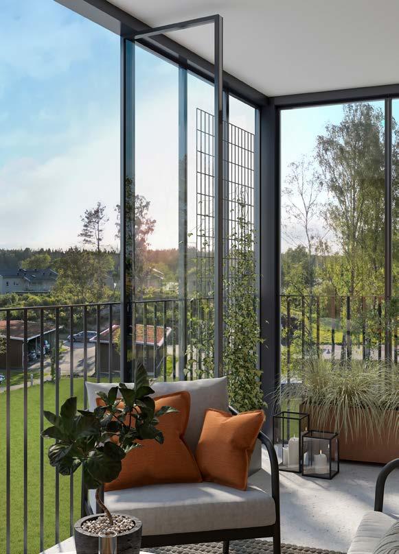 Planlösningarna är genomgående öppna och smart planerade. De är som gjorda för yngre familjer med barn eller för dig som bor i villa och vill komma ned i storlek. De generösa och inglasade balkongerna och uteplatserna är cirka 7–9 kvm stora och placerade i sydväst med kvällssol. Lägenheterna på första plan erbjuder även möjligheten att gå rakt ut på föreningens gräsyta.