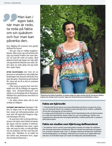 efter pilotstudien som visat att 90 procent av användarna varit nöjda har landstinget inte kommit till beslut hur man ska göra. Patienterna på Gotland får vänta på att få ta del av systemet med plattan. – Alla utom en person har varit helnöjda och vill ha tillbaka sin apparat, säger Ann Hovland-Tånneryd som märkt av en återgång till ett försämrat tillstånd hos patienterna som blivit av med sin platta. – De söker oftare akut och är mer oroliga än tidigare. systemet med digitala lösningar i vården är något som är på frammarsch. Inte minst på informationssidan och som stöd till egenvård fungerar digitala lösningar ofta bra. – Är man inte redo ta till sig informationen vid mötet med vården så spelar det ingen roll hur mycket vi informerar. Med surfplattan kan man i egen takt, när man är redo, ta reda på fakta om sin sjukdom och hur man kan påverka den. Tekniken är så enkel att den heller inte skrämmer bort, säger Ann Hovland-Tånneryd. l