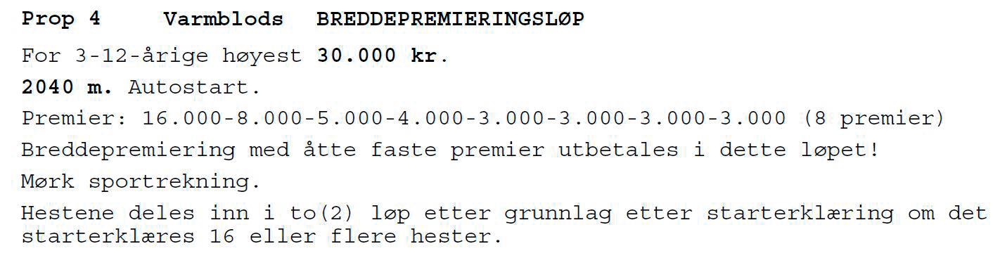 Løpet er skrevet ut for varmblodshester høyest kr. 30.000,-. Nytt er at om det blir starterklært 16 eller flere hester vil løpet bli delt i to løp, etter grunnlag etter starterklæring. Begge løpene kjøres med 8 faste premier, og 16.000 kr i førstepremie.