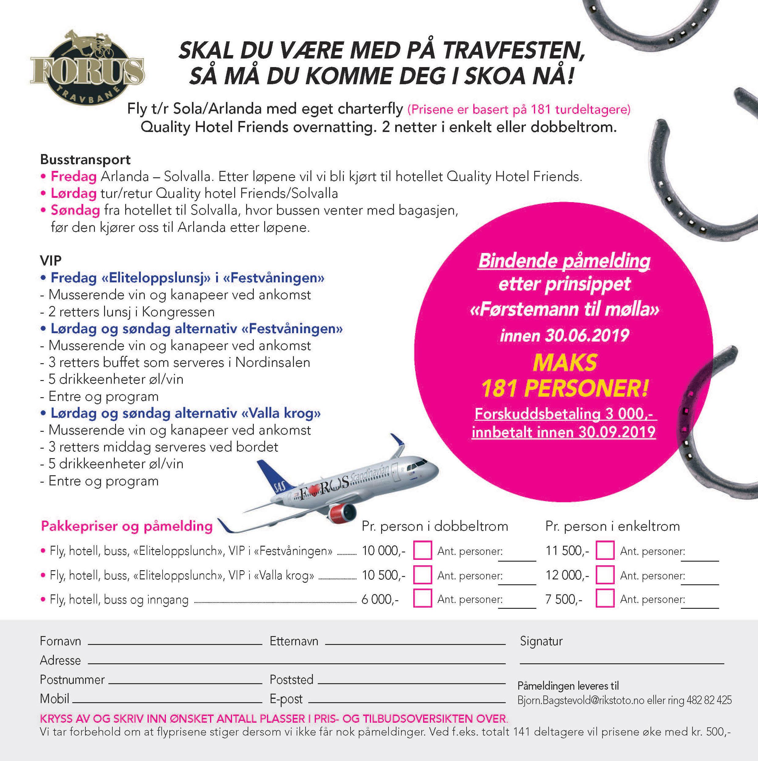 Bindende påmelding ved å overføre kroner 500,- pr. person til Jæren travklubb kontonummer 3325 60 344 merket «jubileumsfest» eller Vipps Jæren travklubb konto 558252, samt sende en SMS bekreftelse til Elisabeth mobil 95980629 Påmelding innen 30 september