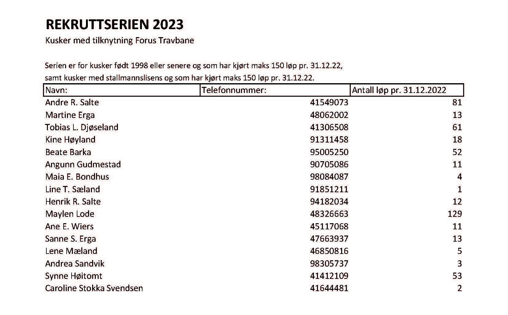 Tussa v. Høiby Kongen Oppdr.: Per Arne Haga Eier: Per Arne Haga /Randaberg rød m/hvitt kryss G. Tollefsen F 30/10-10/2 2040 3 36,3 14 150 G. Tollefsen F 17/11-08/2 2060 0 38,2 g 14 229 G. Tollefsen F 30/11-02/6 2040 1 33,9 14 533 G. Tollefsen F 19/02-08/1 2040 - dg 16 67 G. Tollefsen F 03/03-09/2 2060 4 38,7 14 38 F Gunleif Tollefsen (T) - Per Arne Haga 3 2023: 2 0 -1 -0 -0 -33,3v -7.000 2022: 2 -0 -0 -0 -1 -36,6v -5.500 Tot: 4 - 0 - 1 - 0 - 1 VERDALS ODIN 3 33,3M 12.500 4 år Brun V v. Moe Odin e. Verdals Faxå v. Järvsöfaks Oppdr.: Knut Bærheim Eier: Arild Salte-Tone Salte svart m/blå ermstriper og reklame R. Wiig F 12/10-p/3 2060 h P 40,5 g 0 P R. Wiig F 17/11-08/5 2040 0 46,3 14 442 R. Wiig F 21/12-03/5 2040 4 36,6 14 177 S. Wassberg F 20/01-01/1 2040 0 34,7 14 79 R. Wiig F 03/03-09/2 2040 2 33,3 g 14 50 F Rune Wiig (T) - Arild Salte 4 2023: 4 0 -0 -1 -3 -31,7a -16.500 2022: 3 -0 -1 -0 -0 -33,4v -7.000 Tot: 10 - 0 - 2 - 1 - 5 STINA Ø.K. 2060 1 33,0M 31,7AM 34.500 9 år Svart HP v. Tomdin Ø.K. e. Spydhild v. Elding Oppdr.: Stall Davenskø Eier: Maren Anda /Ytre Arna Blå, hvite seler m&svarte stjerner,rek S. Wassberg BT 07/08-02/1 2100 t - dg r 16 66 D. Kvamsdal BT 13/02-02/4 2120 7 36,1 g 14 322 D. Kvamsdal BT 25/02-01/3 2120 4 33,0 18 508 D. Kvamsdal BT 05/03-08/2 2100 4 31,7a 16 222 S. Wassberg F 11/03-01/1 2040 3 32,9a 18 137 F Thomas Sverre Karlsen (A) - Ove Kenneth Karlsen (T) 5 2023: 5 0 -0 -2 -3 -31,9a -21.000 2022: 9 -0 -0 -2 -5 -32,6v -24.000 Tot: 14 - 0 - 0 - 4 - 8 VILJE 2 32,0M 31,9AM 45.000 6 år Mørkbr HP v. Horgen Tore e. Tekno Mor v. Moe Odin Oppdr.: Tina Dale Brauti Eier: Geir Arne Eriksen /Aksdal Svart m/hvitt skl.stykke, rekl. J. Eriksen F 20/01-01/3 2060 3 32,8 14 92 J. Eriksen F 28/01-01/5 2040 5 32,6 g 18 332 J. Eriksen BT 25/02-01/1 2140 3 32,0 18 284 B. Steine BT 05/03-08/5 2100 5 31,9a 16 63 J. Eriksen F 11/03-01/3 2040 5 33,0ag 18 283 F Svein Ove Wassberg (T) - Geir Arne Eriksen (T) 6 2023: 3 0 -0 -0 -3 -32,2v -10.000 2022: 14 -0 -1 -3 -3 -31,0a -31.500 Tot: 29 - 0 - 1 - 4 - 11 KLEPPSON 3 31,5M 31,0AM 61.500 6 år Brun V v. Dotterud Teddy e. Lodda v. Lome Elden Oppdr.: Christine Gundersen Eier: Ann May Sveinungsen-Natalie Pedersen Cerise m/sort sidefelt og ermer. rekl. N. Pedersen ST 15/08-03/3 2160 5 35,6 r 16 186 Å. Tengsareid B 08/11-02/5 2140 0 br 20 110 N. Pedersen ST 11/02-01/5 2180 6 32,2 18 536 N. Pedersen F 19/02-08/1 2060 6 32,5 g 16 398 E. Høitomt F 11/03-08/6 2040 6 33,7a 40 200 ST Natalie Pedersen (A) 7 2023: 1 0 -0 -1 -0 -31,8v -5.000 2022: 7 -0 -1 -0 -3 -32,2a -22.958 Tot: 8 - 0 - 1 - 1 - 3 ØYGARD RONJA 4 31,8M 32,2AM 27.958 4 år Mørkbr HP v. Bork Odin e. Påls Tina v. Elding Oppdr.: Olaf Moldal Eier: Laila Kjøniksen /Ørje Beige m/svart seler&ermer,hv skstk,rek C. Antonsen J 22/05-08/2 2100 0 38,6 g 20 229 C. Antonsen ÅR 07/06-05/2 2140 5 34,5 0 718 C. Antonsen AR 19/07-07/6 2120 2 34,2 0 176 C. Antonsen B 25/08-03/5 2100 0 32,2a 40 1018 J. Eriksen ST 13/03-08/6 2160 3 31,8 g 14 40 ST Johan Kringeland Eriksen (T) 8 2023: 1 0 -0 -0 -1 -31,8v -3.000 2022: 3 -0 -0 -0 -2 -32,8v -7.000 Tot: 18 - 0 - 3 - 3 - 7 SKEIE SAM 5 31,8M 33,1AM 53.500 6 år Borket V v. Bork Odin e. Lome Mai v. H.G. Balder Oppdr.: Henning Skeie Eier: Katrine Samuelsen /Bryne Svart m/gullbånd,rød søm,rekl. K. Djøseland F 18/11-03/6 2080 0 33,7 14 275 P. Buer BT 05/05-03/3 2120 4 32,8 16 34 P. Buer BT 19/05-04/3 2120 0 36,4 g 16 90 Å. Tengsareid K 28/05-05/7 2100 6 33,1a 16 119 K. Djøseland F 19/02-08/8 2060 5 31,8 16 405 F Kjetil Djøseland (T) - Katrine Samuelsen