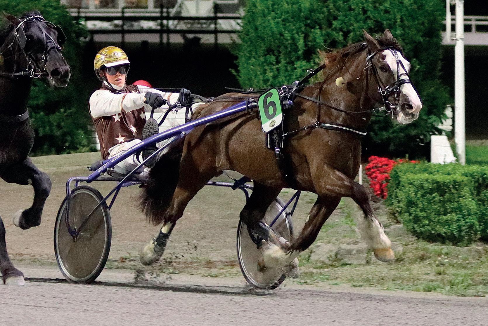 4 år Svartbrun HP v. Maharajah (S) e. Indy's Lindy (US) v. S.J.'s Caviar Oppdr.: Arvid Evertsen Eier: Magnar Tveiten /Sandnes rød m/tre svarte stolper/ermstr.+rekl.
