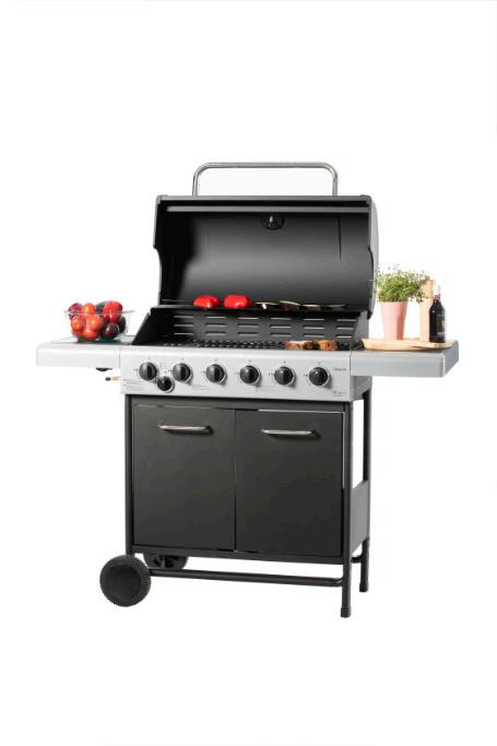 Kaasugrilli6:llaRST-polttimella.Tuotteenmitatkoottuna137,5x54,5x110cm. RST-polttimienteho6x2,35kW,kokonaisteho14,1kW.Sivukeittimenteho2,5kW. Grillausala75x40cm.Paistopinnatvalurautaa.Mukanapyöreäparilaosaja nostokoukku.Runkojakansipulverimaalattuaterästä.Sivutasot.Kaappi,jossakaksi ovea.Takuu2vuotta.