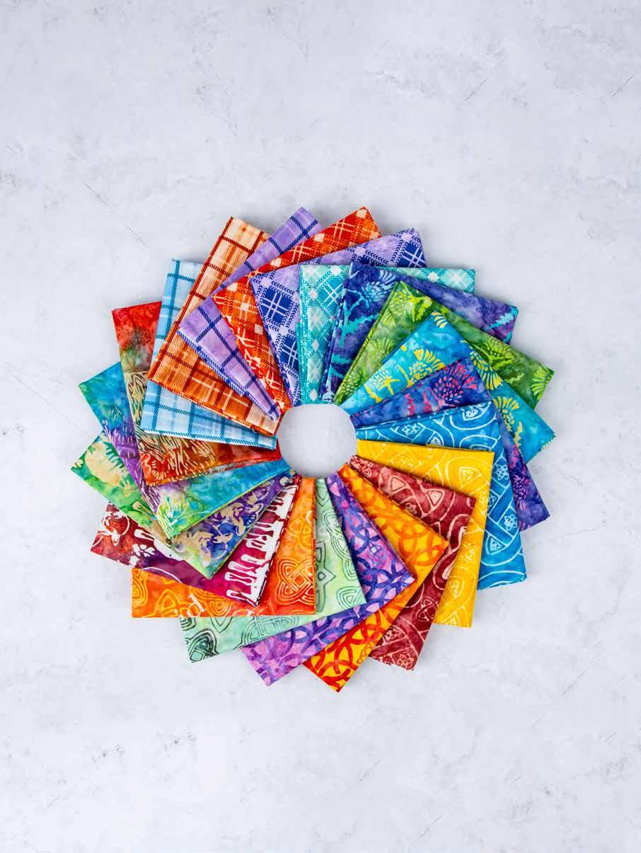 Heavily saturated tone on tone brights of that trending palette. Those multi-colored combinations that are so unqiue to batiks!