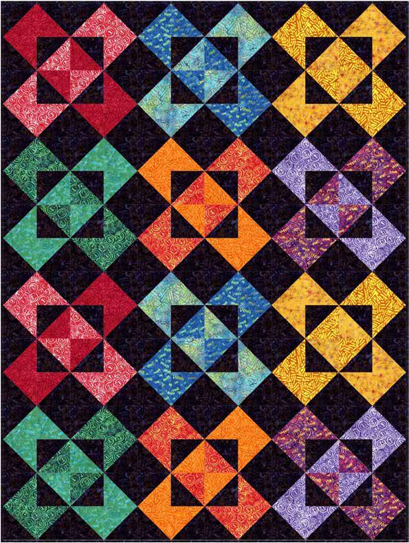 Fantastic impact project! Showcases the dramatically intense colorations in this collection. Easy to kit, great beginner classroom opportunity with the variety of piecing, but repetitive blocks.