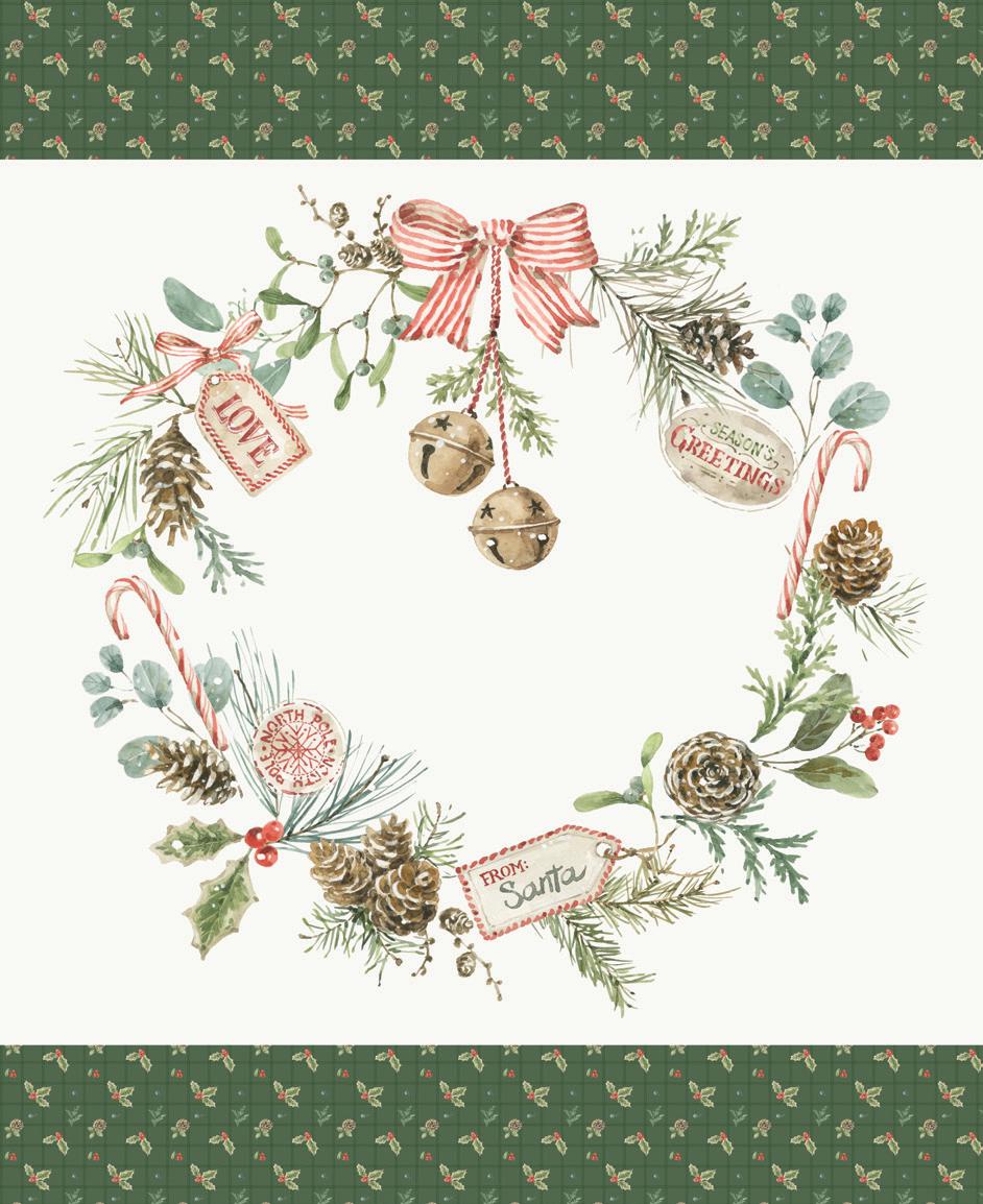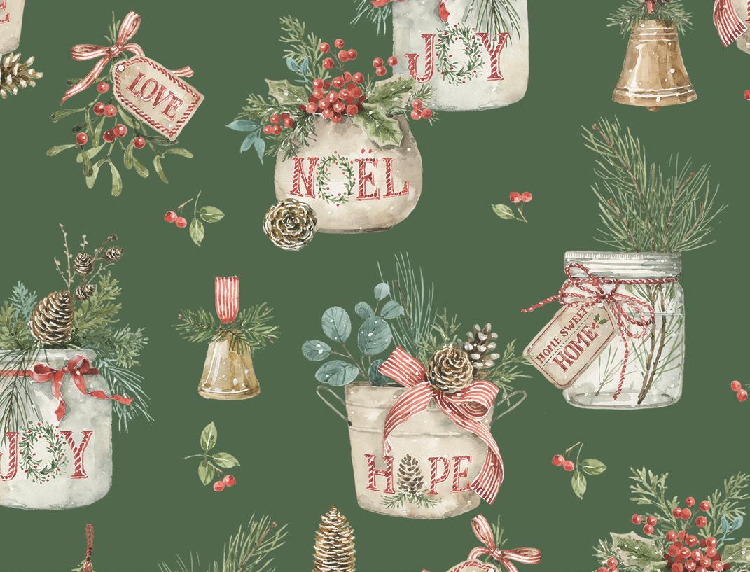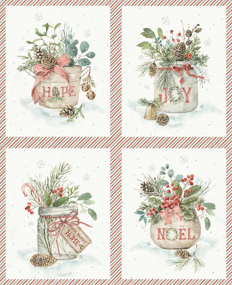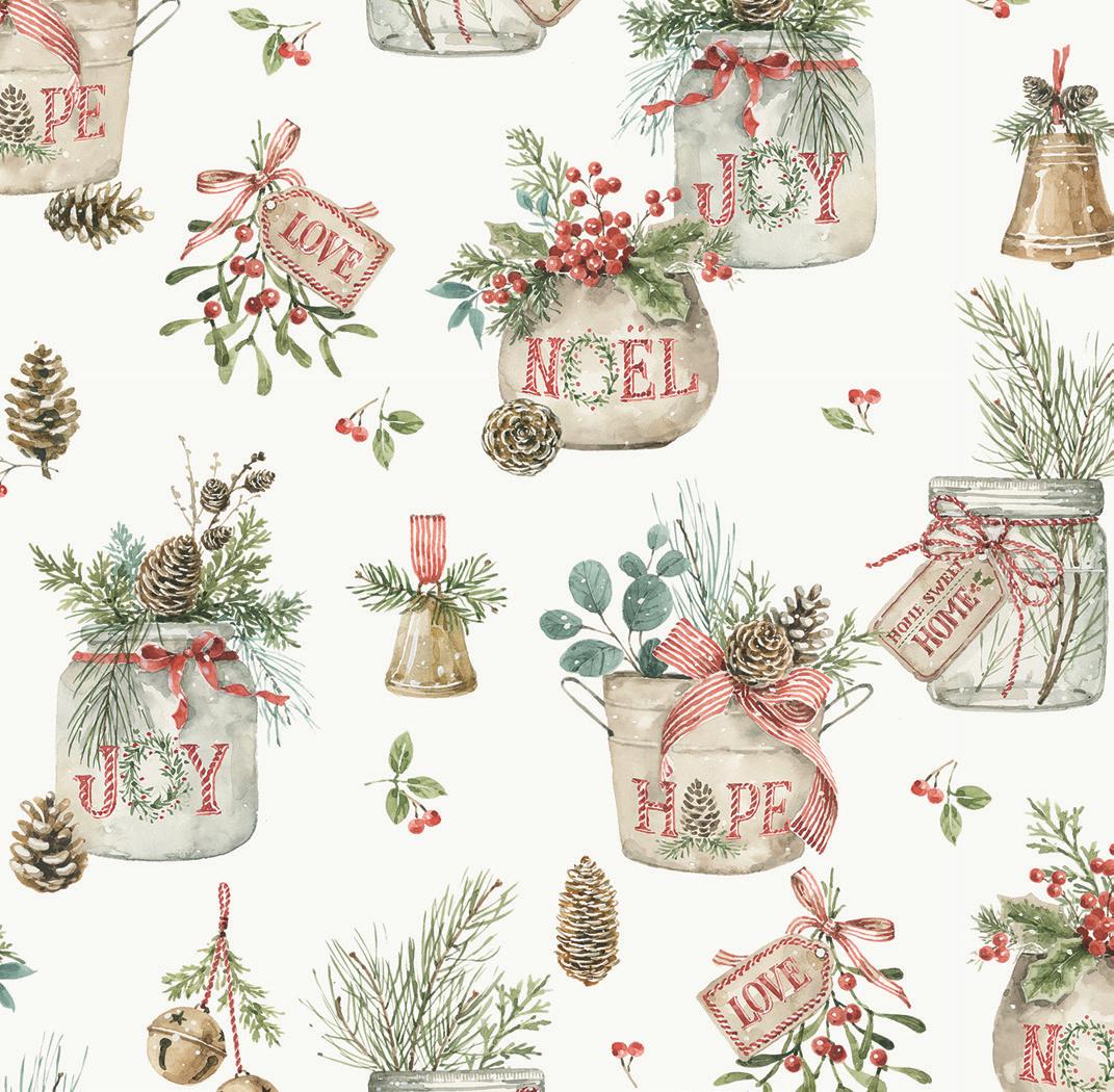 Holiday Spirit by Lisa Audit captures the magic of the season with soft watercolor brushstrokes and timeless holiday motifs. Festive jars and pots overflow with Christmas sprays of holly berries, pinecones, eucalyptus, and evergreen—each one tied with candy cane-striped ribbons and sweet tags from Santa himself In a classic palette of red, green, and cream, this Noël-inspired collection brings warmth, tradition, and a touch of whimsy to your holiday sewing Whether you’re creating quilts, stockings, or handmade gifts, Holiday Spirit is full of seasonal charm and heartfelt cheer .
