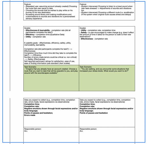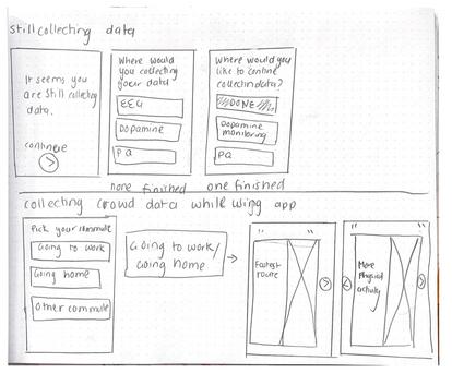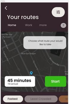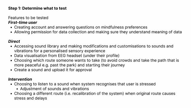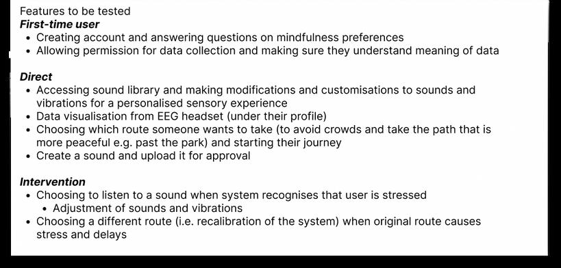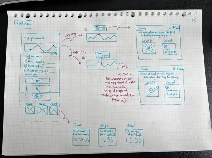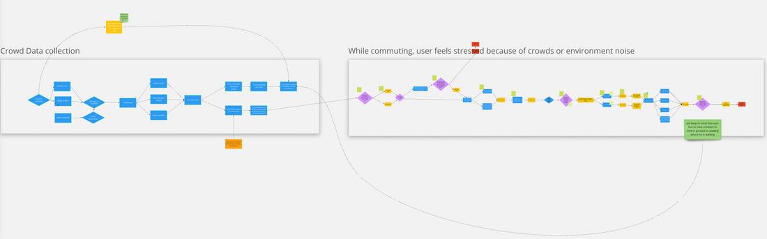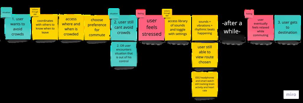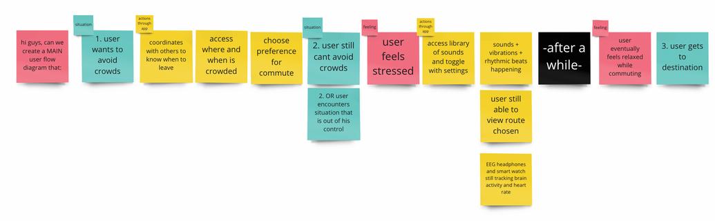 After identifying the key phases of product development, we mapped out a user flow diagram for a potential persona (from one of our previous A1) who could be using our app. We do this by combining two of our user flow diagrams - one looking at accessing crowd data and choice of commuting route, and the other at choice and creation of soundscapes and the customisation of sounds. Vibrations was the additional feature.
