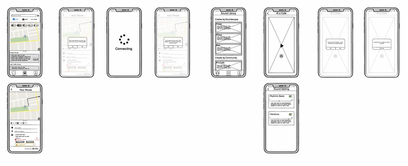 At this stage, while we are ideating for novelty, we knew that it was also important to follow the principle of familiarity - that is, not to veer too far away from the interface of current applications. For example, we drew inspiration for our route-mapping portion from Google Maps, and our soundscape portion from Sensate and Calm (meditation apps).